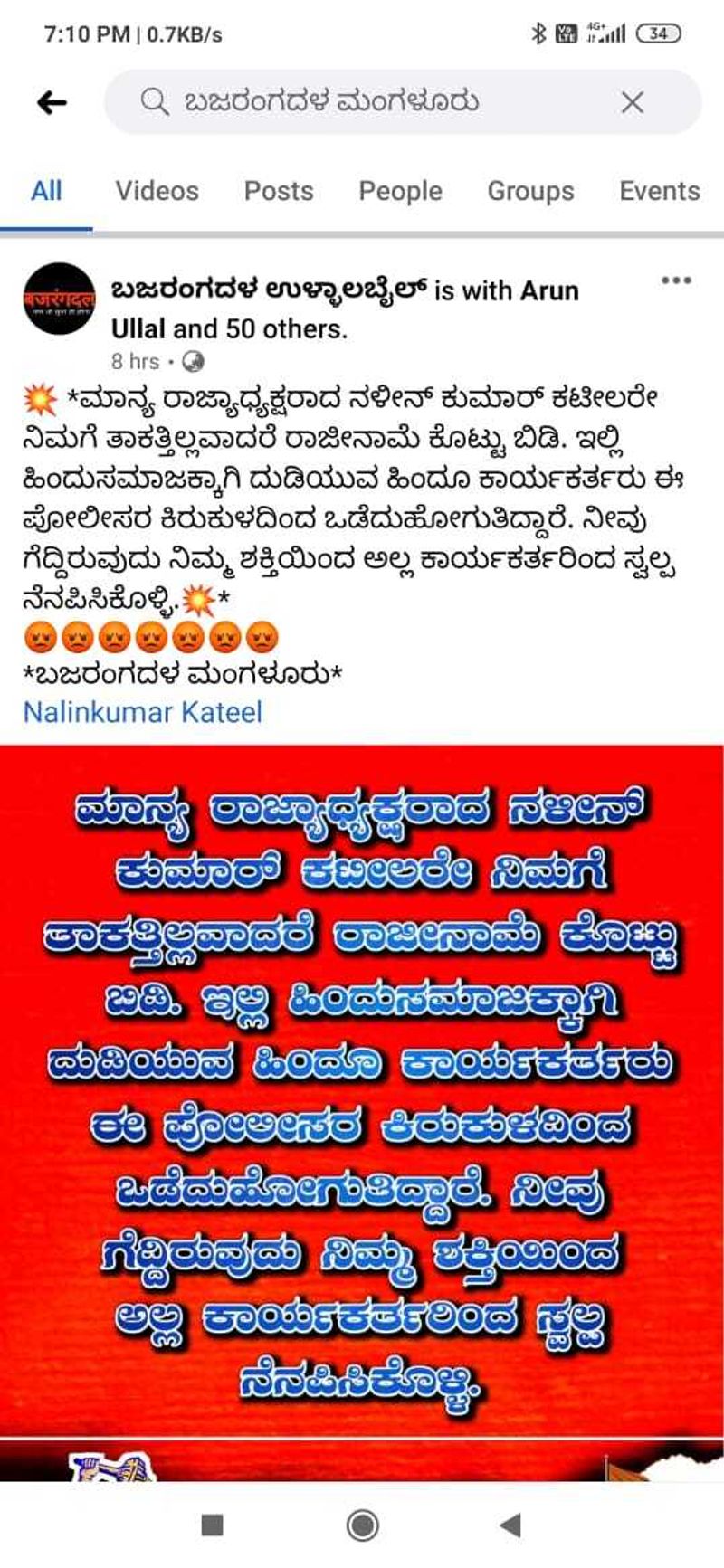 ಕರಾವಳಿಯ ಬಿಜೆಪಿ ಶಾಸಕರು, ಸಂಸದರು ಮತ್ತು ಬಿಜೆಪಿ ಸರ್ಕಾರಕ್ಕೆ ಬಳೆ ಕಳುಹಿಸುತ್ತಿದ್ದೇವೆ ಎಂದೂ ಅನೇಕ ಕಾರ್ಯಕರ್ತರು ಪೋಸ್ಟ್ ಮಾಡಿದ್ದು, ನಿಮಗೆ ತಾಕತ್ತಿಲ್ಲದಿದ್ದರೆ ರಾಜೀನಾಮೆ ಕೊಟ್ಟು ಬಿಡಿ ಅಂತ ನಳಿನ್ ಕಟೀಲ್ ವಿರುದ್ಧ ಕಿಡಿ ಕಾರಿದ್ದಾರೆ.
