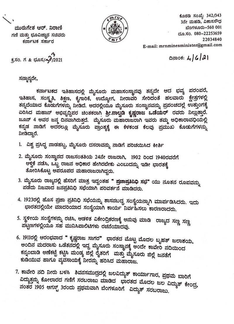 ರಾಜ್ಯದ ಪ್ರಮುಖ ಸ್ಥಳಗಳಲ್ಲಿ ನಾಲ್ವಡಿ ಕೃಷ್ಣರಾಜ ಒಡೆಯರ್ ಅವರ ಪ್ರತಿಮೆ ಸ್ಥಾಪನೆ, ಪಠ್ಯ ಪುಸ್ತಕಗಳಲ್ಲಿ ಜೀವನ ಚರಿತ್ರೆ ಅಳವಡಿಕೆ, ಕೈಗಾರಿಕಾ ಹಾಗೂ ಪ್ರತಿ ವರ್ಷ ಜೂ.4 ರಂದು ಜನ್ಮ ದಿನಾಚರಣೆಯನ್ನು ಸರ್ಕಾರದ ವತಿಯಿಂದಲೇ ಆಚರಣೆ ಮಾಡುವಂತೆ ಸಚಿವ ಮುರುಗೇಶ್ ನಿರಾಣಿ ಕೋರಿದ್ದಾರೆ.