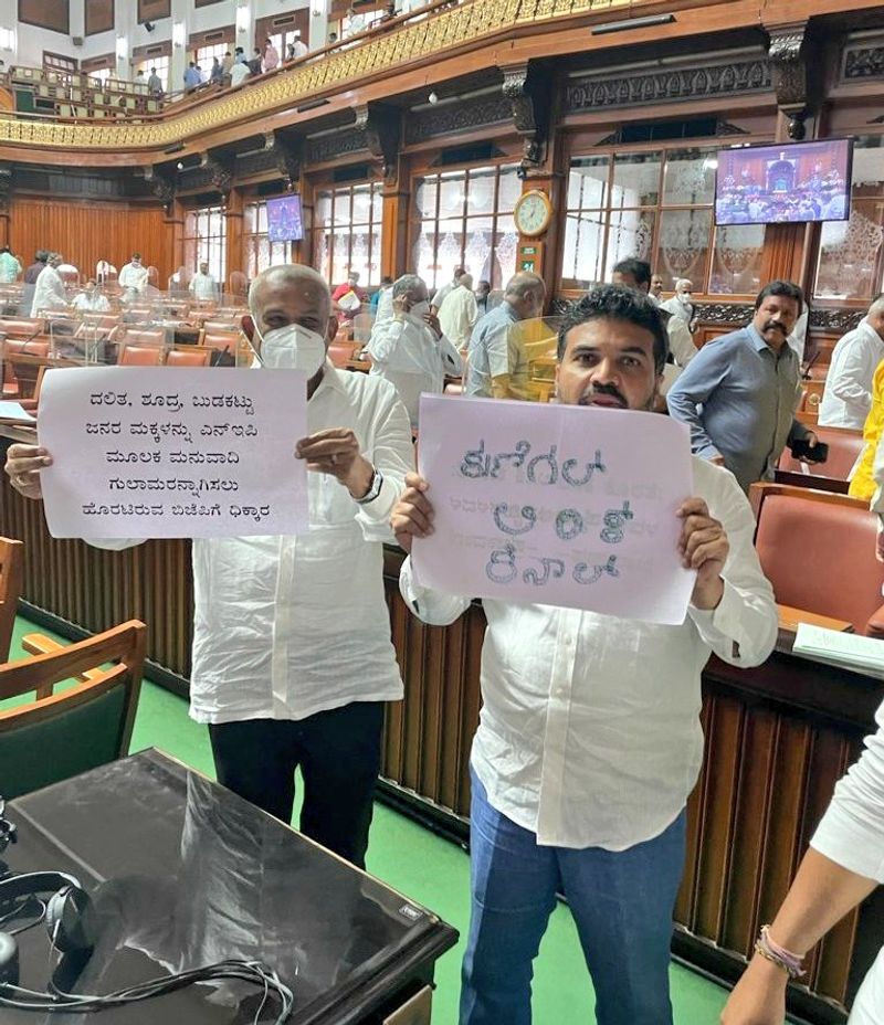 ಹೇಮಾವತಿ ಅಣೆಕಟ್ಟೆಯಿಂದ ಕುಣಿಗಲ್ ಲಿಂಕ್ಕೆನಾಲ್ಗೆ ನೀರು ಹರಿಸಲು ಆಗ್ರಹಿಸಿ ಕುಣಿಗಲ್ ಶಾಸಕ ಡಾ. ರಂಗನಾಥ್, ರಾಷ್ಟ್ರೀಯ ಶಿಕ್ಷಣ ನೀತಿ ವಿರೋಧಿಸಿ ದೊಡ್ಡಬಳ್ಳಾಪುರ ಶಾಸಕ ವೆಂಕಟರಮಣಯ್ಯ ವಿಧಾನಸಭೆಯಲ್ಲಿ ಭಿತ್ತಿಪತ್ರ ಪ್ರದರ್ಶಿಸಿ, ಸಭಾಧ್ಯಕ್ಷರ ಪೀಠದ ಎದುರು ಪ್ರತಿಭಟಿಸಿದರು. ರಾಷ್ಟ್ರೀಯ ಶಿಕ್ಷಣ ನೀತಿ ಮೂಲಕ ದಲಿತರು, ಹಿಂದುಳಿದ ವರ್ಗಗಳು ಹಾಗೂ ಶೋಷಿತ ಸಮುದಾಯಗಳನ್ನು ಗುಲಾಮರನ್ನಾಗಿ ಮಾಡಲು ಮುಂದಾಗಿದ್ದಾರೆ ಎಂದು ಭಿತ್ತಿಪತ್ರ ಪ್ರದರ್ಶಿಸಿದರು. ಈ ವೇಳೆ ವಿಪಕ್ಷ ನಾಯಕ ಸಿದ್ದರಾಮಯ್ಯ, ಕೆಪಿಸಿಸಿ ಅಧ್ಯಕ್ಷ ಡಿ.ಕೆ. ಶಿವಕುಮಾರ್(DK Shivakumar) , ರಾಮಲಿಂಗಾರೆಡ್ಡಿ ಸೇರಿದಂತೆ ಹಿರಿಯ ನಾಯಕರೂ ಸಹ ಸದನದ ಬಾವಿಗಿಳಿದು ಧರಣಿ ನಡೆಸಿದರು. ಸ್ಪೀಕರ್ ಈ ವೇಳೆ ಸದನವನ್ನು ಅನಿರ್ದಿಷ್ಟಾವಧಿಗೆ ಮುಂದೂಡಿದರು.