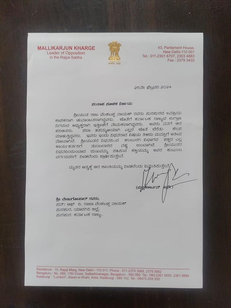 ಸಂತಾಪ ಸೂಚಿಸಿದ ಮಲ್ಲಿಕಾರ್ಜುನ ಖರ್ಗೆ: ತನ್ನ ಆಪ್ತ ರಾಜಾ ವೆಂಕಟಪಟ್ಟ ನಾಯಕ ಅವರ ನಿಧನದ ಬಗ್ಗೆ ಸಂತಾಪ ವ್ಯಕ್ತಪಡಿಸದ ಎಐಸಿಸಿ ಅಧ್ಯಕ್ಷ ಮಲ್ಲಿಕಾರ್ಜುನ ಖರ್ಗೆ ಅವರು, ನನ್ನ ಆತ್ಮೀಯರೂ ಆದ ರಾಜಾ ವೆಂಕಟಪ್ಪ ನಾಯಕ್ ನಿಧನರಾಗಿದ್ದಾರೆ. ಸುರಪುರದ ಜನಪ್ರಿಯ ಶಾಸಕರಾಗಿ ಚುನಾಯಿತರಾಗಿದ್ದವರು. ಜೊತೆಗೆ ಕರ್ನಾಟಕ ರಾಜ್ಯದ ಉಗ್ರಾಣ ನಿಗಮದ ಅಧ್ಯಕ್ಷರಾಗಿ ಇತ್ತೀಚೆಗೆ ನೇಮಕವಾಗಿದ್ದವರು. ಅವರು ನನಗೆ ಚಿರ ಪರಿಚಿತರು. ಸದಾ ಹಸನ್ಮುಖಿಯಾಗಿ ಎಲ್ಲರ ಜೊತೆ ಬೆರೆತು ಕೆಲಸ ಮಾಡುತ್ತಿದ್ದವರು. ಇವರು ಇಂದು ನಿಧನರಾದ ವಿಷಯ ತಿಳಿದು ಮನಸ್ಸಿಗೆ ಅತೀವ ನೋವಾಗಿದೆ. ಶ್ರೀಯುತರ ನಿಧನದಿಂದ ಕಲಬುರಗಿ ವಿಭಾಗದ ಪಕ್ಷದ ಎಲ್ಲ ಕಾರ್ಯಕರ್ತರಿಗೆ ತುಂಬಲಾರದ ನಷ್ಟ ಉಂಟಾಗಿದೆ. ಶ್ರೀಯುತರ ನಿಧನದಿಂದುಂಟಾದ ದುಃಖವನ್ನು ಸಹಿಸುವ ಶಕ್ತಿಯನ್ನು ಅವರ ಕುಟುಂಬ ವರ್ಗದವರಿಗೆ ನೀಡಲೆಂದು ಪ್ರಾರ್ಥಿಸುತ್ತೇನೆ. ಮೃತರ ಆತ್ಮಕ್ಕೆ ಚಿರ ಶಾಂತಿಯನ್ನು ನೀಡಲೆಂದು ವಿನಂತಿಸುತ್ತೇನೆ ಎಂದು ಸಂತಾಪ ಸೂಚಿಸಿದರು.