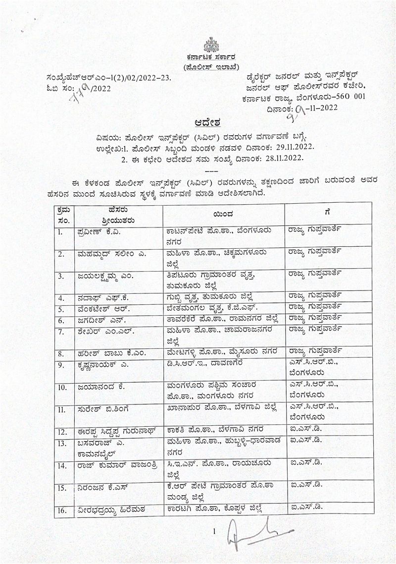 ಬೆಂಗಳೂರು (ನ.29): ರಾಜ್ಯ ಪೊಲೀಸ್ ಇಲಾಖೆಯಲ್ಲಿ ಮಂಗಳವಾರ ಮತ್ತೆ ಸರಕಾರ ಮೇಜರ್ ಸರ್ಜರಿ ಮಾಡಿದೆ. ಒಟ್ಟು 30 ಇನ್ಸ್ಪೆಕ್ಟರ್ಗಳನ್ನು ಸರ್ಕಾರ ವರ್ಗಾವಣೆ ಮಾಡಿ ಆದೇಶವನ್ನು ಹೊರಡಿಸಿದೆ. ಸೋಮವಾರ ಕೂಡ ಇಲಾಖೆಯಲ್ಲಿ ಮೇಜರ್ ಸರ್ಜರಿ ಮಾಡಲಾಗಿತ್ತು. 108 ಇನ್ಸ್ ಪೆಕ್ಟರ್ ಗಳ ವರ್ಗಾವಣೆ ಮಾಡಲಾಗಿತ್ತು. ಇಂದು ಮತ್ತೆ 30 ಇನ್ಸ್ ಪೆಕ್ಟರ್ ವರ್ಗಾವಣೆ ಮಾಡಿ ಸರ್ಕಾರದ ಆದೇಶ ಹೊರಡಿಸಿದೆ. ಕಾಟನ್ ಪೇಟೆ ಠಾಣೆಯಿಂದ ಪ್ರವೀಣ್ , ಚಿಕ್ಕಮಗಳೂರು ಮಹಿಳಾ ಠಾಣೆಯಿಂದ ಮಹಮ್ಮದ್ ಸಲೀಂ, ತಿಪಟೂರು ಗ್ರಾಮಾಂತ ಠಾಣೆಯಿಂದ ಜಯಲಕ್ಷ್ಮಮ್ಮ ಸೇರಿ ಒಟ್ಟು 30 ಮಂದಿಯ ವರ್ಗಾವಣೆಯಾಗಿದೆ. ವರ್ಗಾವಣೆ ಆಗಿರುವವರ ಸಂಪೂರ್ಣ ವಿವರ ಇಲ್ಲಿದೆ.