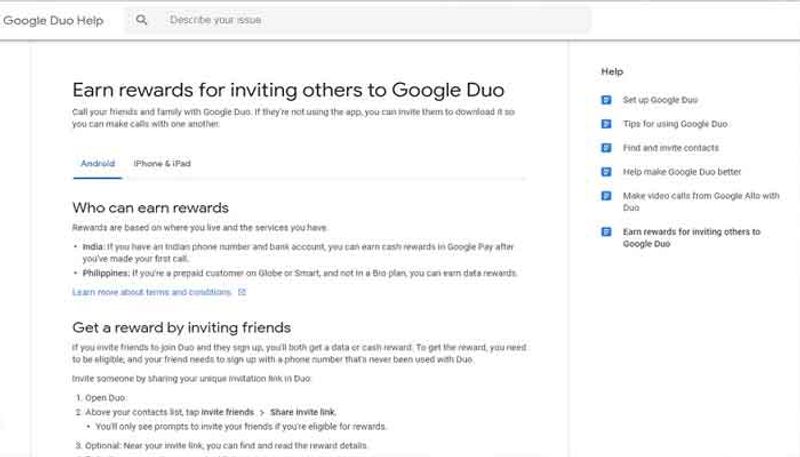ಈ ಕುರಿತಾಗಿ ಗೂಗಲ್ ಸಪೋರ್ಟ್ ಪೇಜ್ನಲ್ಲಿ ಮಾಹಿತಿ ನೀಡಲಾಗಿದ್ದು 'ಒಂದು ವೇಳೆ ನಿಮ್ಮ ಬಳಿ ಭಾರತೀಯ ಫೋನ್ ನಂಬರ್ ಹಾಗೂ ಭಾರತೀಯ ಬ್ಯಾಂಕ್ನಲ್ಲಿ ಅಕೌಂಟ್ ಇದ್ದರೆ, ಆ್ಯಪ್ ಮೂಲಕ ಮೊದಲ ಕರೆ ಮಾಡಿದ ಮರುಕ್ಷಣದಿಂದ ಗೂಗಲ್ ಪೇ ಕ್ಯಾಶ್ ರಿವಾರ್ಡ್ ಪಡೆಯಲು ಅರ್ಹರಾಗುತ್ತೀರಿ' ಎಂದು ಬರೆದಿದ್ದಾರೆ. ಇನ್ನು ಬಳಕೆದಾರರು ತಮ್ಮ ಕಾಂಟ್ಯಾಕ್ಟ್ಕ್ಗಳಿಗೆ ಗೂಗಲ್ ಡ್ಯುವೋ ಬಳಸಲು ಆಮಂತ್ರಿಸುವ ಮೂಲಕವೂ ಕ್ಯಾಶ್ ರಿವಾರ್ಡ್ ಗಳಿಸಬಹುದು ಎಂಬ ಮಾಹಿತಿಯೂ ಲಭ್ಯವಾಗಿದೆ.