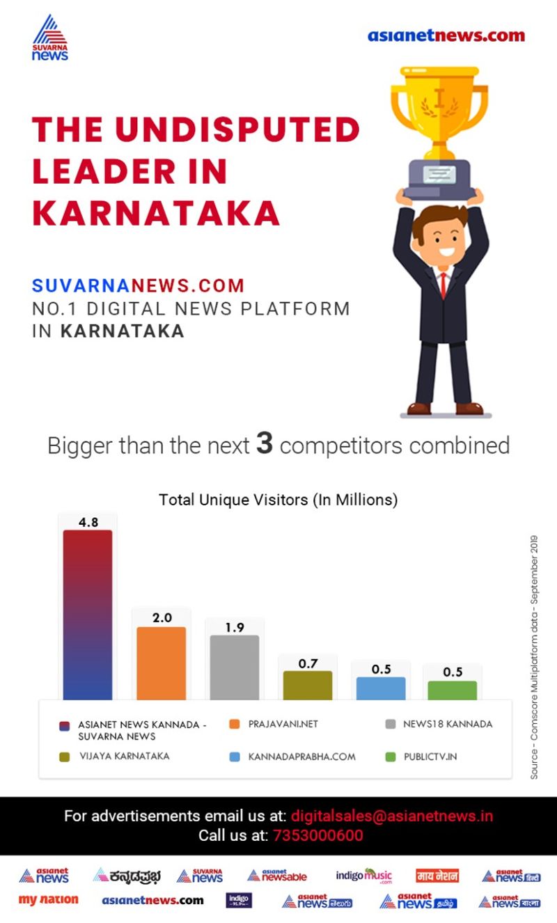 ಡಿಜಿಟಲ್ ಮಾಧ್ಯಮ ಲೋಕದಲ್ಲಿ ನಂ.1 ಸುದ್ದಿತಾಣವಾಗಿ ತನ್ನದೇ ಛಾಪು ಮೂಡಿಸಿರುವ www.suvarnanews.com, ಈಗ ಮತ್ತೊಂದು ಸಾಧನೆಯನ್ನು ಮಾಡಿದೆ. ಹೌದು, ಸುವರ್ಣ ನ್ಯೂಸ್ ಯ್ಯೂಟ್ಯೂಬ್ ಚಾನೆಲ್ ಈಗ 20 ಲಕ್ಷ [2 ಮಿಲಿಯನ್] ಬಳಕೆದಾರರನ್ನು ಹೊಂದುವ ಮೂಲಕ ಕನ್ನಡ ಸುದ್ದಿ ಮಾಧ್ಯಮದ ಇತಿಹಾಸದಲ್ಲಿ ಹೊಸ ದಾಖಲೆಯನ್ನು ನಿರ್ಮಿಸಿದೆ.