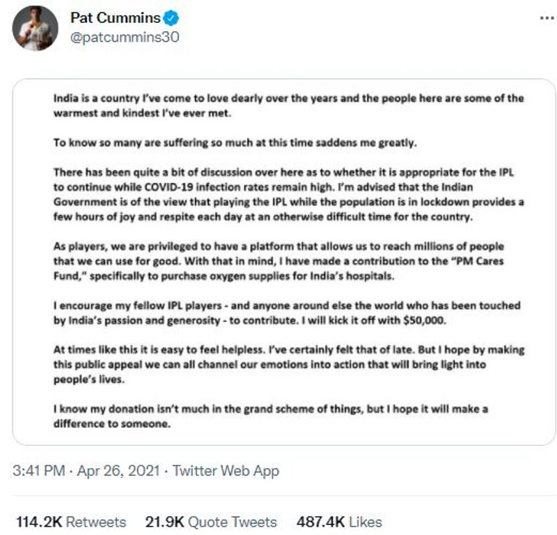 ಭಾರತದಲ್ಲಿ COVID-19 ರ ಎರಡನೇ ಅಲೆ ಸಮಯದಲ್ಲಿ ಟ್ವೀಟರ್ ಅಗತ್ಯ ಸಂಪನ್ಮೂಲಗಳನ್ನು ಹುಡುಕುವ ಮೂಲವಾಗಿದ್ದರಿಂದ, ಹೆಚ್ಚಿನ ಸಂಖ್ಯೆಯ ಜನರು ಸಂಕಷ್ಟದಲ್ಲಿದ್ದವರಿಗೆ ಸಹಾಯ ಮಾಡಲು ಮತ್ತು ಬೆಂಬಲಿಸಲು ಟ್ವೀಟರನ್ನು ಬಳಸಿದ್ದಾರೆ. ಅವರಲ್ಲಿ ಆಸ್ಟ್ರೇಲಿಯಾದ ಕ್ರಿಕೆಟಿಗ ಪ್ಯಾಟ್ ಕಮ್ಮಿನ್ಸ್ ಅವರು ಏಪ್ರಿಲ್ನಲ್ಲಿ ಭಾರತದಲ್ಲಿ COVID-19 ಪರಿಹಾರಕ್ಕಾಗಿ ತಮ್ಮ ದೇಣಿಗೆಯನ್ನು ಘೋಷಿಸಲು ಟ್ವೀಟ್ ಮಾಡಿದ ಸಂದೇಶವು 2021 ರಲ್ಲಿ ಭಾರತದಲ್ಲಿ ಅತಿ ಹೆಚ್ಚು ಮರುಟ್ವೀಟ್ ಮಾಡಿದ ಟ್ವೀಟ್ ಆಗಿದೆ. ಇದನ್ನು ಇಲ್ಲಿಯವರೆಗೆ 114,000 ಕ್ಕೂ ಹೆಚ್ಚು ಬಾರಿ ರಿಟ್ವೀಟ್ ಮಾಡಲಾಗಿದೆ.