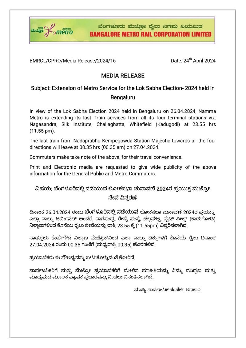 ಬೆಂಗಳೂರಿನಲ್ಲಿ ನಡೆಯುವ ಲೋಕಸಭಾ ಚುನಾವಣೆ 2024ರ ಪ್ರಯುಕ್ತ ಮೆಟ್ರೋ ಸೇವೆ ವಿಸ್ತರಣೆ ಮಾಡಲಾಗಿದೆ. ಏ.26ರಂದು ಬೆಂಗಳೂರಿನಲ್ಲಿ ನಡೆಯುವ ಲೋಕಸಭಾ ಚುನಾವಣೆ 2024ರ ಪ್ರಯುಕ್ತ ಎಲ್ಲಾ ನಾಲ್ಕು ಟರ್ಮಿನಲ್ ಅಂದರೆ ನಾಗಸಂದ್ರ, ರೇಷ್ಮೆ ಸಂಸ್ಥೆ, ಚಲ್ಲಘಟ್ಟ ಹಾಗೂ ವೈಟ್ ಫೀಲ್ಡ್ (ಕಾಡುಗೋಡಿ) ನಿಲ್ದಾಣಗಳಿಂದ ಕೊನೆಯ ರೈಲು ಸೇವೆಯನ್ನು ರಾತ್ರಿ 23.55ಕ್ಕೆ (11.55pm) ವಿಸ್ತರಿಸಲಾಗಿದೆ ಎಂದು ಬಿಎಂಆರ್ಸಿಎಲ್ ಮಾಹಿತಿ ನೀಡಿದೆ.