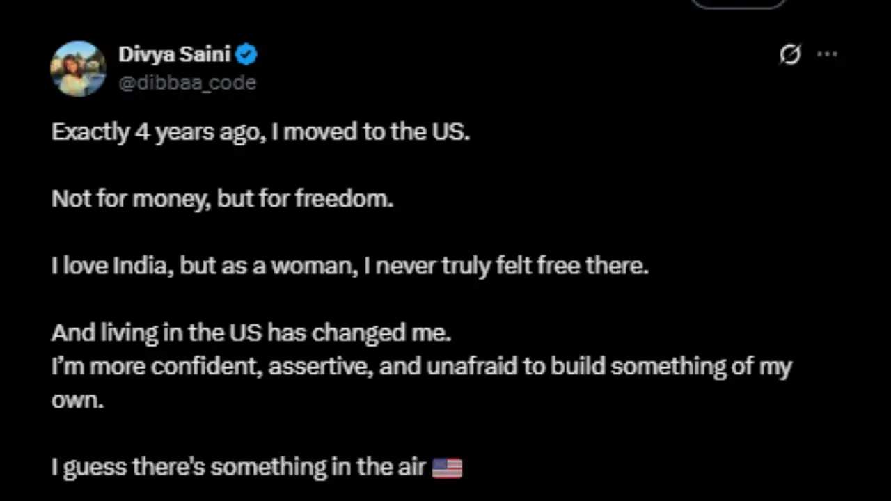 ದಿವೈ ಸೈನಿ ಎಂಬುವವರು ಟ್ವಿಟ್ನಲ್ಲಿ ಈ ಬಗ್ಗೆ ಪೋಸ್ಟ್ ಮಾಡಿದ್ದು, ತಾನು ನಾಲ್ಕು ವರ್ಷಗಳ ಹಿಂದೆ ಅಮೆರಿಕಾಗೆ ಹೋಗಿದ್ದೆ. ಆದರೆ ಹಣದ ಕಾರಣಕ್ಕೆ ಅಲ್ಲ ಕೇವಲ ಸ್ವಾತಂತ್ರ್ಯದ ಕಾರಣಕ್ಕೆ ಆದರೆ ನಾನು ಭಾರತವನ್ನೂ ಈಗಲೂ ಪ್ರೀತಿಸುತ್ತಿದ್ದೇನೆ ಎಂದು ಸ್ಪಷ್ಟನೆ ನೀಡಿದ್ದಾರೆ. ಆದರೆ ತಮ್ಮ ಈ ಒಂದು ನಿರ್ಧಾರದಿಂದ ತಮ್ಮ ಬದುಕು ಎಷ್ಟೊಂದು ಅದ್ಭುತವಾಗಿ ಬದಲಾಯಿತು ಎಂದು ಅವರು ಹೇಳಿದ್ದಾರೆ.