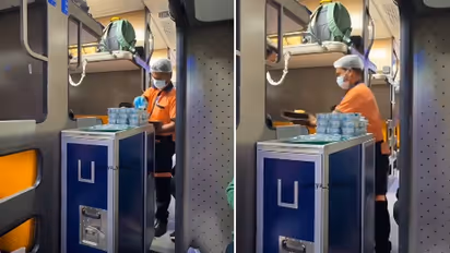 ಈ ಕ್ಲಿಪ್ನಲ್ಲಿ ರೈಲ್ವೆ ಸಿಬ್ಬಂದಿಯೊಬ್ಬರು ಸ್ವಚ್ಛವಾದ ಬೋಗಿಯೊಳಗೆ ಕೈಗವಸು, ಮಾಸ್ಕ್ ಮತ್ತು ಹೇರ್ನೆಟ್ ಧರಿಸಿ, ಸೀಲ್ ಮಾಡಿದ ಊಟದ ಬಾಕ್ಸ್ಗಳನ್ನು ಹಂಚುತ್ತಿರುವುದು ಕಾಣಿಸುತ್ತದೆ. ಅವರು ದೊಡ್ಡ, ಮುಚ್ಚಿದ ನೀಲಿ ಬಣ್ಣದ ಟ್ರಾಲಿಯನ್ನು ಬಳಸುತ್ತಿದ್ದು, ಅದು ಕೂಡಾ ಅಚ್ಚುಕಟ್ಟಾಗಿ ಕಾಣುತ್ತಿದೆ.