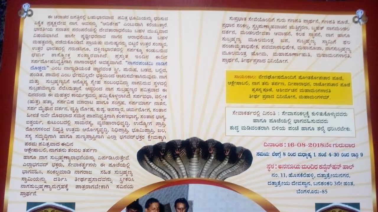 ದೃಷ್ಟಿ ದೋಷ, ಚರ್ಮ ರೋಗ, ಸಂತಾನ ಹೀನತೆ, ಕುಟುಂಬದ ಸಾಮರಸ್ಯ, ಸಂಪತ್ತು ವೃದ್ಧಿ ಮುಂತಾದ ಕಾರಣಗಳ ಪರಿಹಾರಕ್ಕೋಸ್ಕರ ಭಕ್ತರು ಆದಿಶೇಷನ ಕೃಪೆಗೆ ಪಾತ್ರರಾಗಬಹುದು. ಹೊಸಕೆರೆಹಳ್ಳಿ ದತ್ತಾತ್ರೇಯ ನಗರದ ದತ್ತಾತ್ರೇಯ ದೇವಾಲಯದಲ್ಲಿ ಧಾರ್ಮಿಕ ಕಾರ್ಯಕ್ರಮ ನಡೆಯಲಿದೆ.