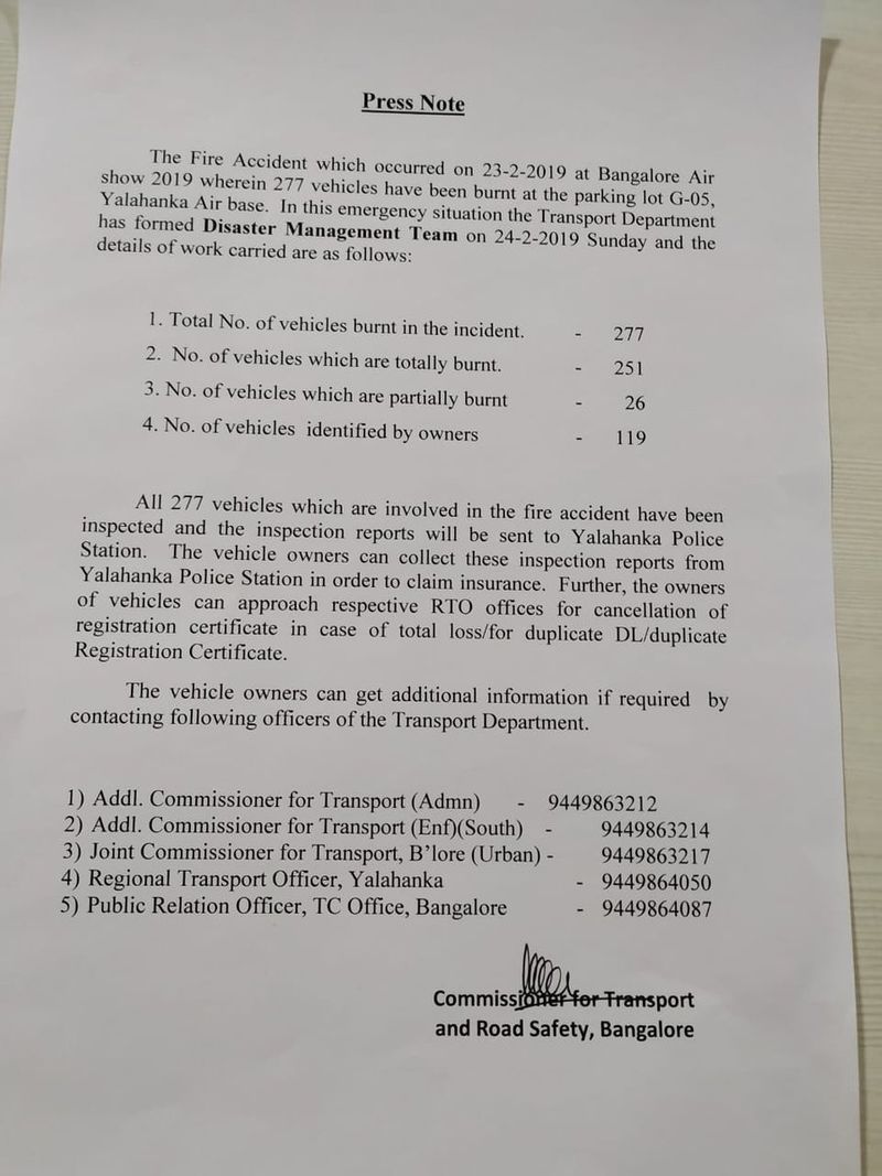 ಏರೋ ಇಂಡಿಯಾ ಶೋನ ನಡೆದ ಪಾರ್ಕಿಂಗ್ ದುರಂತದಲ್ಲಿ 277 ಕಾರುಗಳು ಸುಟ್ಟು ಹೋಗಿವೆ. ಇದರಲ್ಲಿ 113 ಕಾರುಗಳನ್ನ ಮಾಲೀಕರು ಪತ್ತೆ ಹಚ್ಚಿದ್ದರೆ, ಇನ್ನುಳಿದ ಕಾರುಗಳ ಮಾಲೀಕರಿಗೆ ತಮ್ಮ ಕಾರು ಯಾವುದೇ ಎಂದು ಪತ್ತೆ ಹಚ್ಚಲು ಸಾಧ್ಯವಾಗಿಲ್ಲ.