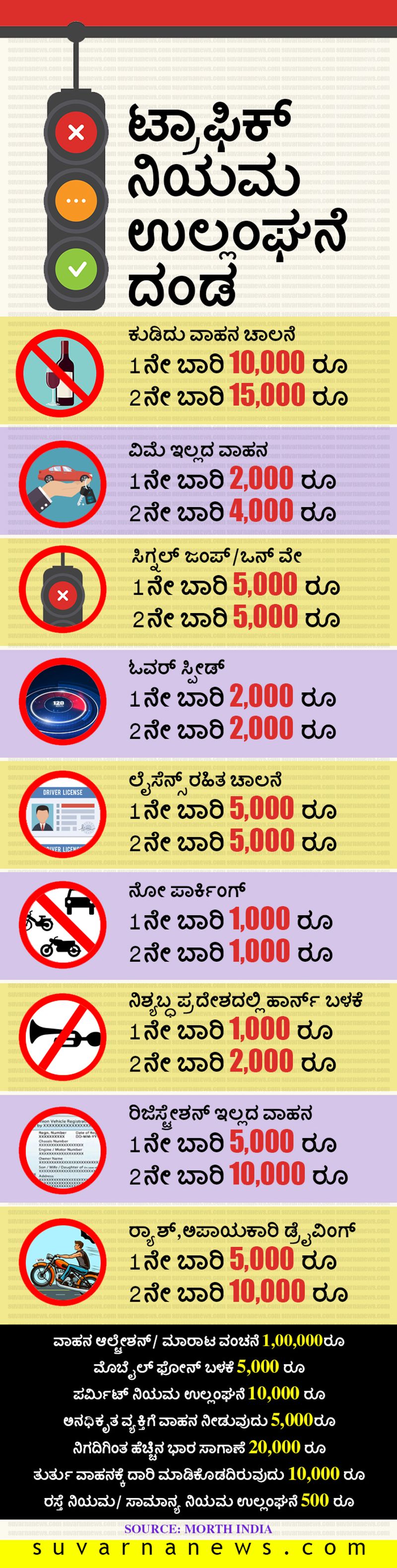 ನೂತನ ನಿಮಯದ ಪ್ರಕಾರ ಟ್ರಾಫಿಕ್ ನಿಯಮ ಉಲ್ಲಂಘನೆ ಹಾಗೂ ದಂಡದ ಮಾಹಿತಿ ಇಲ್ಲಿದೆ.