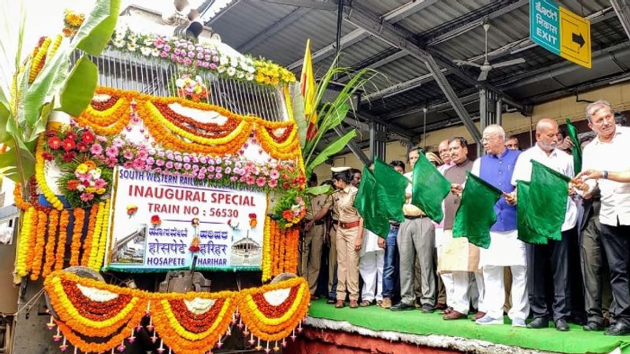 ಬಳ್ಳಾರಿ(ಅ.17): ಸುಮಾರು ನಾಲ್ಕು ದಶಕಗಳ ಬಳಿಕ ಹೊಸಪೇಟೆ-ಹರಿಹರ ರೈಲ್ವೆ ಮಾರ್ಗ ಇಂದು ಉದ್ಘಾಟನೆಯಾಗಿದೆ. ಗುರುವಾರ ಹೊಸಪೇಟೆಯ ರೈಲು ನಿಲ್ದಾಣದಲ್ಲಿ ನೂತನ ಹೊಸಪೇಟೆ-ಹರಿಹರ ರೈಲಿಗೆ ಕೇಂದ್ರ ಸಚಿವ ಸುರೇಶ್ ಅಂಗಡಿ ಅವರು ಚಾಲನೆ ನೀಡಿದರು.