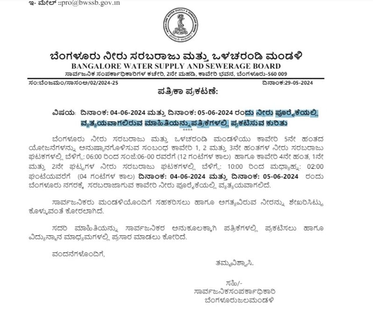 ಬೆಂಗಳೂರಿನಲ್ಲಿ ಮುಂದಿನ ತಿಂಗಳ ಎರಡು ದಿನಗಳ ಕಾಲ ನೀರು ಪೂರೈಕೆಯಲ್ಲಿ ವ್ಯತ್ಯಯವಾಗಲಿದೆ ಎಂದು ಬೆಂಗಳೂರು ನೀರು ಸರಬರಾಜು ಮತ್ತು ಒಳಚರಂಡಿ ಮಂಡಳಿ ಪ್ರಕಟಣೆಯಲ್ಲಿ ತಿಳಿಸಿದೆ.