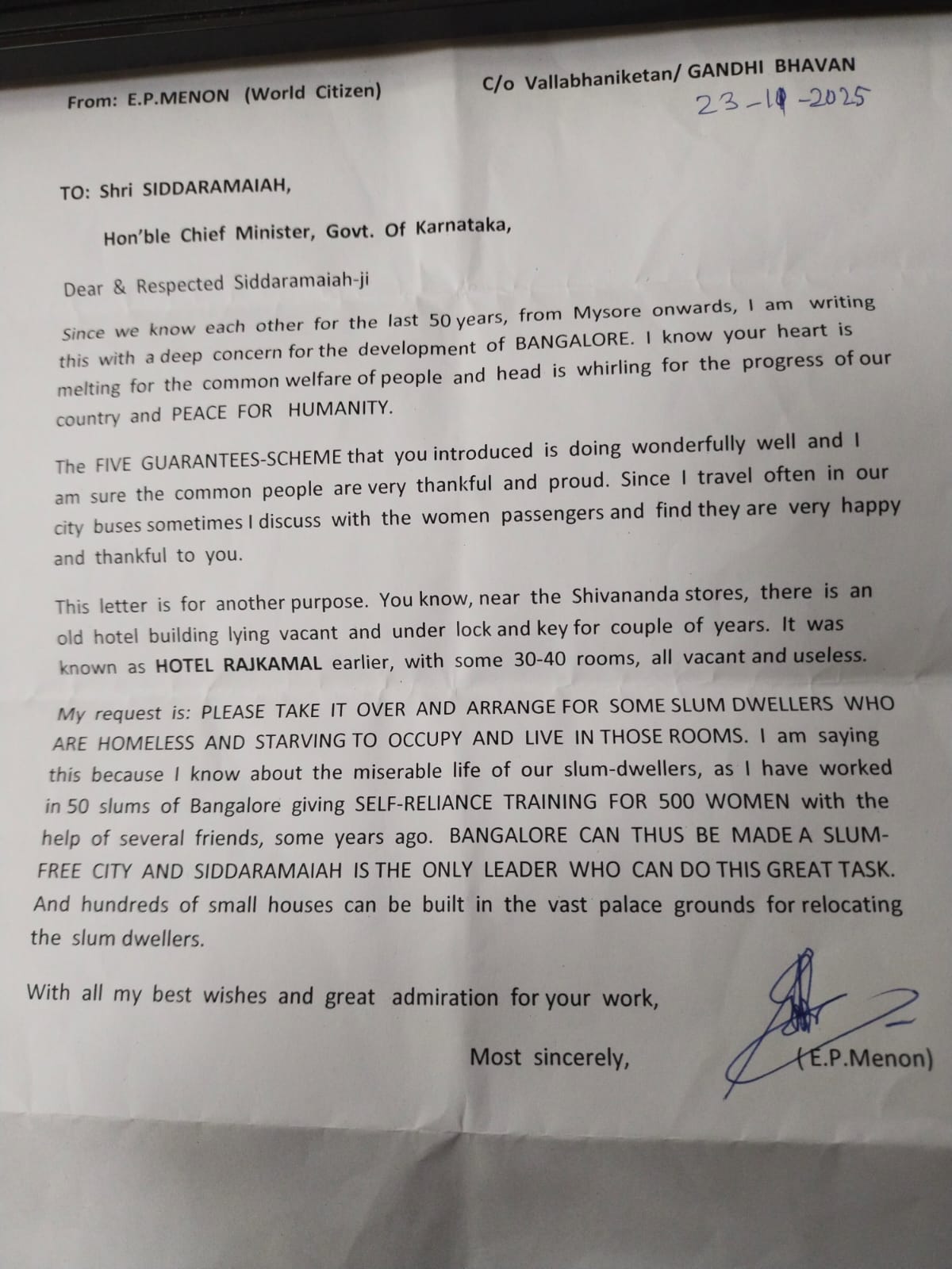 ಶಾಂತಿ ಕಾರ್ಯಕರ್ತ ಇಪಿ ಮೆನನ್, ಬೆಂಗಳೂರಿನ ಶಿವಾನಂದ ಸರ್ಕಲ್ ಬಳಿಯ ಪಾಳುಬಿದ್ದ ಹೋಟೆಲ್ ರಾಜ್ಕಮಲ್ ಜಾಗವನ್ನು ನಿರಾಶ್ರಿತರಿಗೆ ವಸತಿ ಕಲ್ಪಿಸಲು ಬಳಸುವಂತೆ ಸಿಎಂ ಸಿದ್ದರಾಮಯ್ಯಗೆ ಪತ್ರ ಬರೆದಿದ್ದಾರೆ. ಈ ಮೂಲಕ ಬೆಂಗಳೂರನ್ನು ಕೊಳಚೆ ಮುಕ್ತ ನಗರವನ್ನಾಗಿ ಮಾಡುವಂತೆ ಅವರು ಮನವಿ ಮಾಡಿದ್ದಾರೆ.