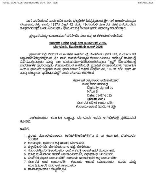 ಇದರಲ್ಲಿ ಮೈಸೂರು ರಸ್ತೆಯಲ್ಲಿರುವ ಗಾಳಿ ಆಂಜನೇಯ ದೇವಸ್ಥಾನವನ್ನ ಮುಜರಾಯಿ ಇಲಾಖೆಗೆ ವರ್ಗಾವಣೆಗೆ ಶಿಫಾರಸು ಮಾಡಲಾಗಿತ್ತು. ಇದನ್ನು ಒಪ್ಪಿರುವ ರಾಜ್ಯ ಸರ್ಕಾರ 1997ರ 42 ಮತ್ತು 43ರನ್ವಯ ಘೋಷಿತ ಸಂಸ್ಥೆ ಎಂದು ಘೋಷಣೆ ಮಾಡಿದೆ.