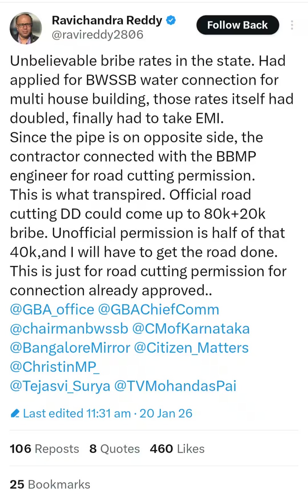 ಬೆಂಗಳೂರು ಮೂಲದ ಸ್ಟಾರ್ಟ್ ಅಪ್ ಸಹ-ಸಂಸ್ಥಾಪಕರೊಬ್ಬರು, ತಮ್ಮ ಕಟ್ಟಡಕ್ಕೆ BWSSB ನೀರಿನ ಸಂಪರ್ಕ ಮತ್ತು ರೋಡ್ ಕಟಿಂಗ್ ಅನುಮತಿಗಾಗಿ ಅಧಿಕಾರಿಗಳು ಭಾರಿ ಲಂಚ ಕೇಳಿದ್ದಾರೆಂದು ಆರೋಪಿಸಿದ್ದಾರೆ. ಅಧಿಕೃತ ಮತ್ತು ಅನಧಿಕೃತ ಮಾರ್ಗಗಳಿಗೆ ಬೇರೆ ಬೇರೆ ಲಂಚದ ದರಗಳನ್ನು ಮುಂದಿಟ್ಟಿದ್ದಾರೆ.