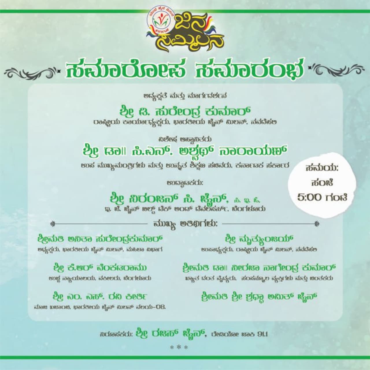 ಬೆಂಗಳೂರಿನಲ್ಲಿ ಜಿನ ಸಮ್ಮಿಲನ 2019 ಕಾರ್ಯಕ್ರಮವನ್ನುಆಯೋಜಿಸಲಾಗಿದೆ. ಧಾರ್ಮಿಕ, ಸಾಂಸ್ಕೃತಿಕ, ಕ್ರೀಡೆ, ಮನೋರಂಜನೆ ಸೇರಿದಂತೆ ಹಲವು ಕಾರ್ಯಕ್ರಮಗಳು ಸಮ್ಮಿಲನ ಈ ಜಿನ ಸಮ್ಮಿಲನದ ವಿಶೇಷ. ಉಪಮುಖ್ಯಮಂತ್ರಿ ಅಶ್ವಥ್ ನಾರಾಯಣ, ಸಂಸದ ತೇಜಸ್ವಿ ಸೂರ್ಯ ಸೇರಿದಂತೆ ಹಲವು ಪ್ರಮುಖ ನಾಯಕರು ಈ ಸಮಾರಂಭದಲ್ಲಿ ಪಾಲ್ಗೊಳ್ಳುತ್ತಿದ್ದಾರೆ.