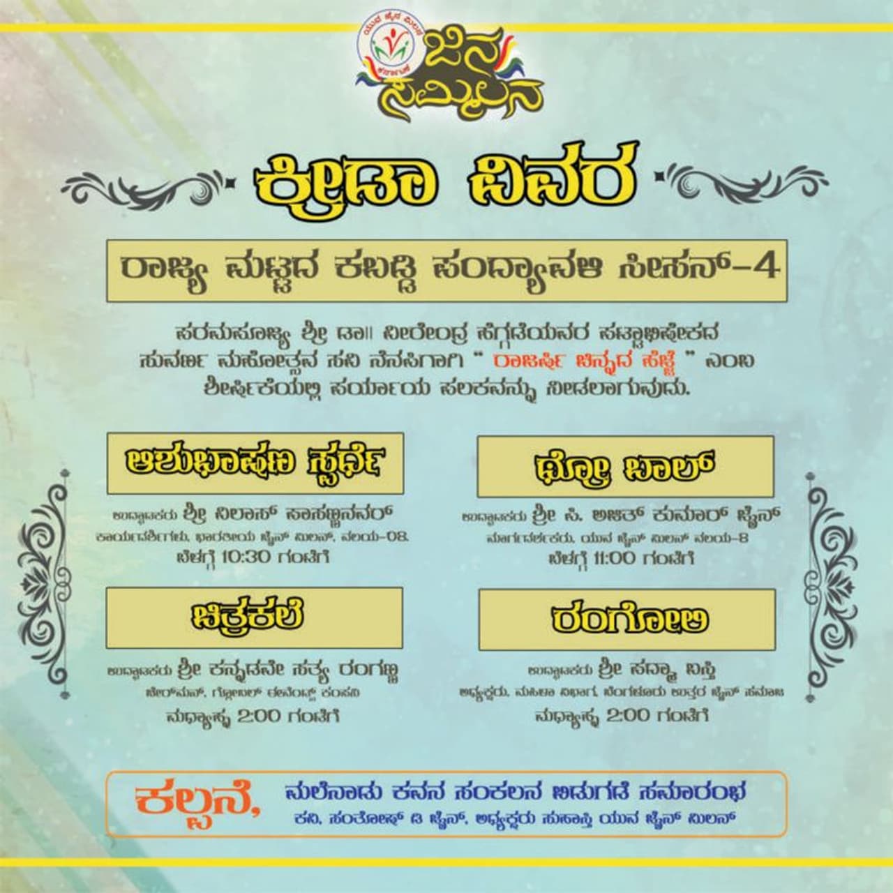 ಧಾರ್ಮಿಕ, ಸಾಂಸ್ಕೃತಿಕ, ಕ್ರೀಡೆ, ಮನೋರಂಜನೆ ಸೇರಿದಂತೆ ಹಲವು ಕಾರ್ಯಕ್ರಮಗಳು ಜಿನ ಸಮ್ಮಿಲನ 2019ರ ಕಾರ್ಯಕ್ರಮದಲ್ಲಿ ಮೇಳೈಸಲಿವೆ. ಜಿನ ಸಮ್ಮಲನ 2019ರಲ್ಲಿ ರಾಜ್ಯ ಮಟ್ಟದ ಕಬಡ್ಡಿ ಪಂದ್ಯಾವಳಿ ಆಯೋಜಿಸಲಾಗಿದೆ. ಇದರ ಜೊತೆಗೆ ಥ್ರೋ ಬಾಲ್, ಚಿತ್ರಕಲೆ, ರಂಗೋಲಿ ಹಾಗೂ ಆಶುಭಾಷಣ ಸ್ಪರ್ಧೆಯನ್ನ ಏರ್ಪಡಿಸಲಾಗಿದೆ.