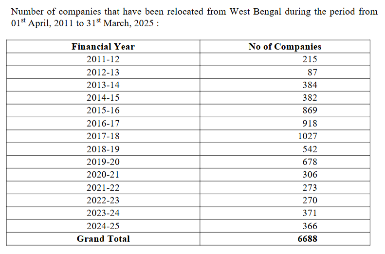 ರಾಜ್ಯಸಭೆಯಲ್ಲಿ ಸಚಿವರು ನೀಡಿದ ಲಿಖಿತ ಉತ್ತರದ ಪ್ರಕಾರ, 2015-16, 2016-17 ಮತ್ತು 2017-18ರಲ್ಲಿ, 869, 918 ಮತ್ತು 1,027 ಕಂಪನಿಗಳು ತಮ್ಮ ನೋಂದಾಯಿತ ಕಚೇರಿಗಳನ್ನು ಪಶ್ಚಿಮ ಬಂಗಾಳದಿಂದ ಇತರ ರಾಜ್ಯಗಳಿಗೆ ಸ್ಥಳಾಂತರಿಸಿವೆ. ಈ ಮೂರು ವರ್ಷಗಳ ಅವಧಿಯು ತೃಣಮೂಲ ಕಾಂಗ್ರೆಸ್ ಸರ್ಕಾರದ ಮೊದಲ ಮತ್ತು ಎರಡನೇ ಅವಧಿಗೆ ಹೊಂದಿಕೆಯಾಗುತ್ತದೆ.