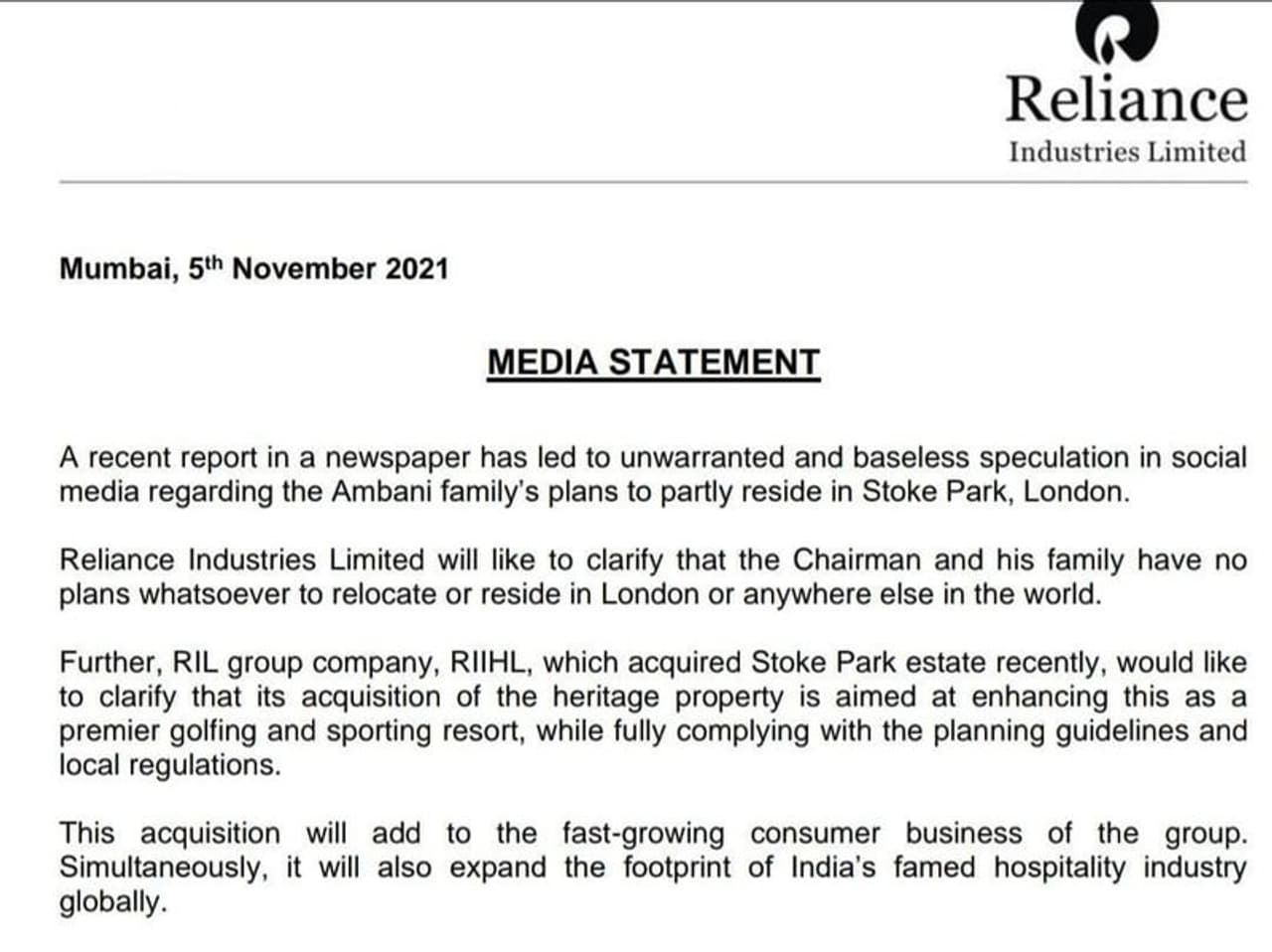 ಈ ಕುರಿತು ರಿಲಯನ್ಸ್ ಗ್ರೂಪ್ ತನ್ನ ರಿಲಯನ್ಸ್ ಇಂಡಸ್ಟ್ರಿಯಲ್ ಇನ್ವೆಸ್ಟ್ಮೆಂಟ್ ಮತ್ತು ಹೋಲ್ಡಿಂಗ್ಸ್ ಲಿಮಿಟೆಡ್ ಇತ್ತೀಚೆಗೆ ಸ್ಟೋಕ್ ಪಾರ್ಕ್ ಎಸ್ಟೇಟ್ನಲ್ಲಿ 300 ಎಕರೆ ಭೂಮಿಯನ್ನು ಖರೀದಿಸಿದೆ ಎಂದು ಹೇಳಿದೆ. ಆದರೆ ಕೇವಲ ಗಾಲ್ಫಿಂಗ್ ಮತ್ತು ಕ್ರೀಡಾ ರೆಸಾರ್ಟ್ ಆಗಿ ಬಳಸುವ ಉದ್ದೇಶದಿಂದ ಈ ಆಸ್ತಿಯನ್ನು ಖರೀದಿಸಲಾಗಿದೆ ಎಂದೂ ಅದು ಸ್ಪಷ್ಟಪಡಿಸಿದೆ. ಇದಕ್ಕಾಗಿ ಸ್ಥಳೀಯ ನಿಯಮಗಳು ಮತ್ತು ಮಾರ್ಗಸೂಚಿಗಳನ್ನು ಅನುಸರಿಸಲಾಗುವುದು. ಈ ಭೂಮಿ ಗುಂಪಿನ ವೇಗವಾಗಿ ಬೆಳೆಯುತ್ತಿರುವ ಗ್ರಾಹಕ ವ್ಯವಹಾರವನ್ನು ಸಂಪರ್ಕಿಸಲು ಸಹಾಯ ಮಾಡುತ್ತದೆ. ಅದೇ ಸಮಯದಲ್ಲಿ, ಭಾರತವು ಆತಿಥ್ಯ ವಹಿಸುವ ಸಂಸ್ಕೃತಿಗೆ ವಿಶ್ವ ದರ್ಜೆಯ ಮನ್ನಣೆಯನ್ನು ನೀಡಲು ನಾವು ಬಯಸುತ್ತೇವೆ ಎಂದು ಕಂಪನಿ ತಿಳಿಸಿದೆ.