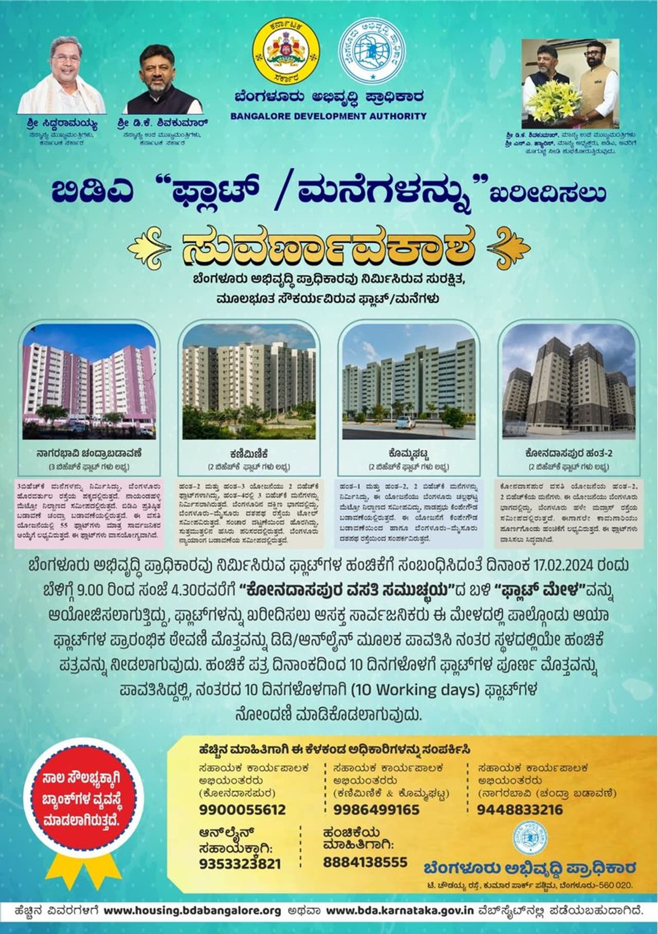 ಬೆಂಗಳೂರು ಅಭಿವೃದ್ಧಿ ಪ್ರಾಧಿಕಾರದಿಂದ ನಿರ್ಮಿಸಲಾದ ವಸತಿ ಸಮುಚ್ಛಯಗಳ ಮನೆಗಳ ಮಾರಾಟಕ್ಕೆ ಫೆ.17ರಂದು ಕೋನದಾಸಪುರದಲ್ಲಿ ಫ್ಲ್ಯಾಟ್ ಮೇಳವನ್ನು ಆಯೋಜಿಸಲಾಗಿದೆ.