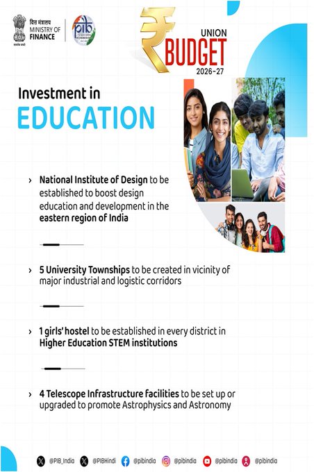 ನವದೆಹಲಿ (ಫೆ.1): ಹಣಕಾಸು ಸಚಿವೆ ನಿರ್ಮಲಾ ಸೀತಾರಾಮನ್ ಅವರು ಭಾನುವಾರ ಲೋಕಸಭೆಯಲ್ಲಿ 2026-27ನೇ ಸಾಲಿನ ಕೇಂದ್ರ ಬಜೆಟ್ ಮಂಡಿಸುವಾಗ, ದೇಶಾದ್ಯಂತ ಶಿಕ್ಷಣ, ಸಂಶೋಧನೆ ಮತ್ತು ಸ್ವಾಸ್ಥ್ಯ ಮೂಲಸೌಕರ್ಯವನ್ನು ಬಲಪಡಿಸುವ ಗುರಿಯನ್ನು ಹೊಂದಿರುವ ಪ್ರಮುಖ ಉಪಕ್ರಮಗಳ ಸರಣಿಯನ್ನು ಅನಾವರಣಗೊಳಿಸಿದರು. ಪ್ರಮುಖ ಘೋಷಣೆಗಳಲ್ಲಿ, ಪ್ರತಿ ಜಿಲ್ಲೆಯಲ್ಲಿ ಬಾಲಕಿಯರ ಹಾಸ್ಟೆಲ್ ಸ್ಥಾಪಿಸುವುದು, ರಾಷ್ಟ್ರೀಯ ಆತಿಥ್ಯ ಸಂಸ್ಥೆಯನ್ನು ಸ್ಥಾಪಿಸುವುದು ಮತ್ತು ಪ್ರಮುಖ ಕೈಗಾರಿಕಾ ಮತ್ತು ಲಾಜಿಸ್ಟಿಕ್ಸ್ ಕೇಂದ್ರಗಳ ಬಳಿ ಐದು ಹೊಸ ವಿಶ್ವವಿದ್ಯಾಲಯ ಪಟ್ಟಣಗಳನ್ನು ಅಭಿವೃದ್ಧಿಪಡಿಸುವುದು ಸರ್ಕಾರದ ಯೋಜನೆಯಾಗಿದೆ.