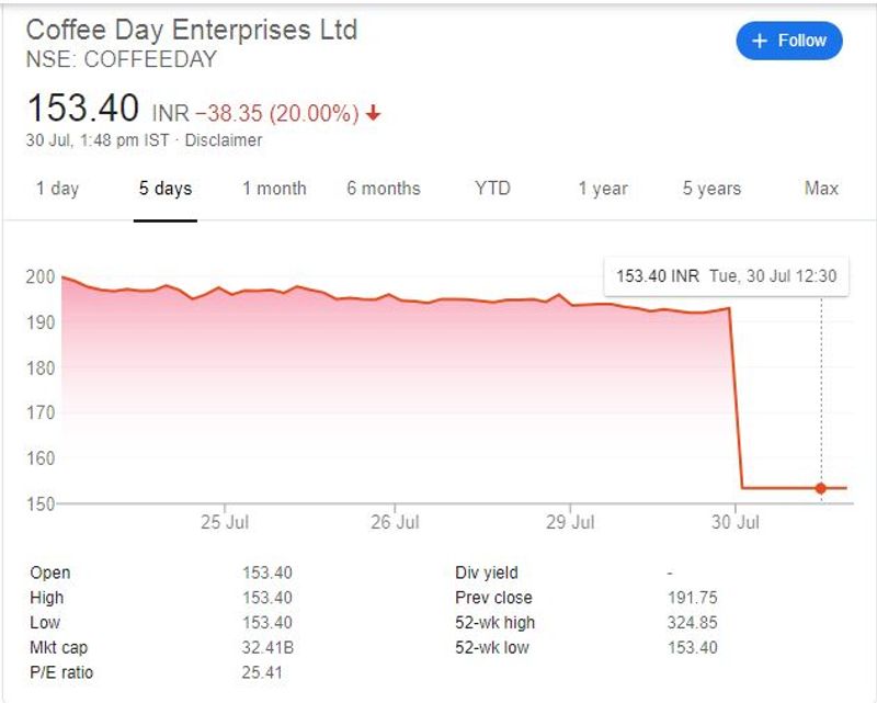 ಸಿದ್ಧಾರ್ಥ ಮಾಲೀಕತ್ವದ ಕೆಫೆ ಕಾಫಿ ಡೇ, ಎಸ್ಐಸಿಎಎಲ್ ಷೇರು ಬೆಲೆ ತೀವ್ರ ಕುಸಿತಗೊಂಡಿದೆ. ನಿನ್ನೆಯ ವಹಿವಾಟು ಮುಕ್ತಾಯದ ಹೊತ್ತಿಗೆ 192 ರೂ ಮೌಲ್ಯವಿದ್ದ ಕೆಫೆ ಕಾಫಿ ಡೇ ಷೇರು ಮಾರುಕಟ್ಟೆ, ಇಂದು ಮಂಗಳವಾರ 153 ರೂಗೆ ಇಳಿದಿದೆ.