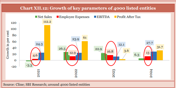 ಕೇಂದ್ರ ಬಜೆಟ್ಗೆ ಒಂದು ದಿನ ಮೊದಲು ಸಂಸತ್ತಿನಲ್ಲಿ ಮಂಡಿಸಲಾದ ವರದಿಯಲ್ಲಿ, ದೇಶದ ಕಾರ್ಪೋರೇಟ್ ಕಂಪನಿಗಳ ಲಾಭವು ಕಳೆದ 15 ವರ್ಷಗಳಲ್ಲಿಯೇ ಗರಿಷ್ಠ ಮಟ್ಟಕ್ಕೆ ಹೋಗಿದೆ. ಆದರೆ, ಉದ್ಯೋಗಿಗಳ ವೇತನದ ವಿಚಾರದಲ್ಲಿ ನಿಶ್ಚಲತೆ ಕಾಣುತ್ತಿದೆ ಎಂದು ಹೇಳಿದೆ. ಎಸ್ಬಿಐ ಮಾಡಿರುವ ರಿಸರ್ಚ್ ಪ್ರಕಾರ, 2004ರಲ್ಲಿ 4 ಸಾವಿರ ಲಿಸ್ಟೆಡ್ ಕಂಪನಿಗಳ ಸರಾಸರಿ ಉದ್ಯೋಗಿ ವೆಚ್ಚಗಳು ಶೇ. 13ರಷ್ಟು ಮಾತ್ರವೇ ಬೆಳೆದಿದ್ದರೆ, ತೆರಿಗೆ ನಂತರದ ಲಾಣವಿ ಶೇ. 31.7ರಷ್ಟು ಏರಿಕೆಯಾಗಿದೆ.