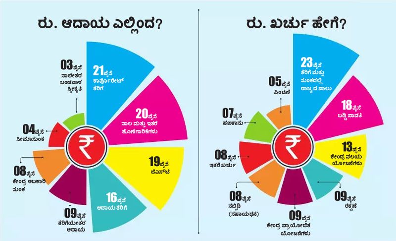 ಸಾಲ ಮತ್ತು ಇತರೆ ಹೊಣೆಗಾರಿಕೆ ಸಂಗ್ರಹ 20 ಪೈಸೆಯಾಗಿದ್ದರೆ, ಆದಾಯ ತೆರಿಗೆಯು 16 ಪೈಸೆಯಾಗಿದೆ. ಇದೇವೇಳೆ ಸರ್ಕಾರ ಹೂಡಿಕೆಯಂತಹ ತೆರಿಗೆಯೇತರ ಆದಾಯಗಳಿಂದ 9 ಪೈಸೆ ಗಳಿಸುವ ಗುರಿ ಹೊಂದಿದ್ದರೆ, 8 ಪೈಸೆ ಕೇಂದ್ರ ಅಬಕಾರಿ ಸುಂಕದಿಂದ, 4 ಪೈಸೆ ಆಮದು ಸುಂಕದಿಂದ, 3 ಪೈಸೆ ಸಾಲೇತರ ಬಂಡವಾಳ ಸ್ವೀಕೃತಿಯಿಂದ ಗಳಿಸಲು ಉದ್ದೇಶಿಸಿದೆ. ವೆಚ್ಚದ ವಿಷಯಕ್ಕೆ ಬಂದಾಗ, ರಾಜ್ಯದೊಂದಿಗಿನ ಪಾಲುಗಾರಿಕೆಯ ತೆರಿಗೆ ಮತ್ತು ಸುಂಕ 23 ಪೈಸೆಯಾಗಿದ್ದು, ಅದಕ್ಕೆ 18 ಪೈಸೆ ಬಡ್ಡಿ ನೀಡಲಾಗುತ್ತಿದೆ.