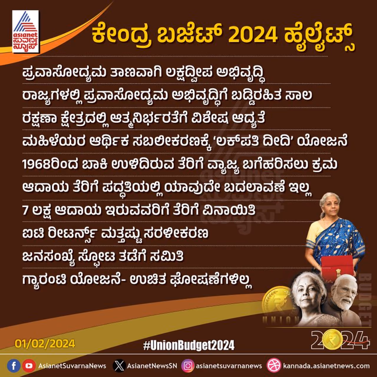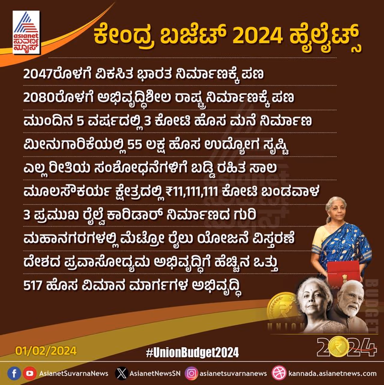 ಈ ಮೊದಲೇ ತಿಳಿಸಿದಂತೆ ವಿತ್ತ ಸಚಿವೆ ನಿರ್ಮಲಾ ಸೀತರಾಮನ್ ಅವರು ಯಾವುದೇ ಭರ್ಜರಿ ಘೋಷಣೆಗಳನ್ನೂ ಮಾಡಿಲ್ಲ. ಮಧ್ಯಂತರ ಬಜೆಟ್ ಇದಾಗಿದ್ದು, ಚುನಾವಣೆ ಗಮನದಲ್ಲಿಟ್ಟುಕೊಂಡು ಮತ ಸೆಳೆಯಲು ಏನಾದರೂ ಹೊಸ ಘೋಷಣೆ ಇರಬಹುದೆಂದು ಅಂದಾಜಿಸಲಾಗಿತ್ತು. ಆದರೆ, ಯಾವುದೇ ಫ್ರೀ ಘೋಷಣೆಯೂ ಇಲ್ಲ. ಕೇಂದ್ರ ಬಜೆಟ್ನಲ್ಲಿ ಯುವ ಜನಾಂಗದ ಅಭಿವೃದ್ಧಿ ಅವರ ಸಂಶೋಧನೆ ಆವಿಷ್ಕಾರಗಳಿಗೆ ನೆರವು ನೀಡುವ ನಿಟ್ಟಿನಲ್ಲಿ ಕೆಲ ಘೋಷಣೆಗಳನ್ನು ಮಾಡಲಾಗಿದ್ದರೆ, ಮಹಿಳಾ ಕಲ್ಯಾಣದ ನಿಟ್ಟಿನಲ್ಲಿ 'ಲಖ್ಪತಿ ದೀದಿ' ಸೇರಿದಂತೆ ಗೆಲುವು ಯೋಜನೆಗಳನ್ನು ಘೋಷಣೆ ಮಾಡಿದೆ. ಒಟ್ಟಾರೆಯಾಗಿ ಇದೊಂದು ಭರವಸೆಯ ಬಜೆಟ್ ಆಗಿದ್ದು, ಮುಂದಿನ ಜುಲೈನಲ್ಲಿ ವಿಕಸಿತ ಭಾರತದ ನೀಲನಕ್ಷೆಯ ಬಜೆಟ್ ಮಂಡಿಸುವುದಾಗಿ ನಿರ್ಮಲಾ ಸೀತಾರಾಮನ್ ತಿಳಿಸಿದ್ದಾರೆ.