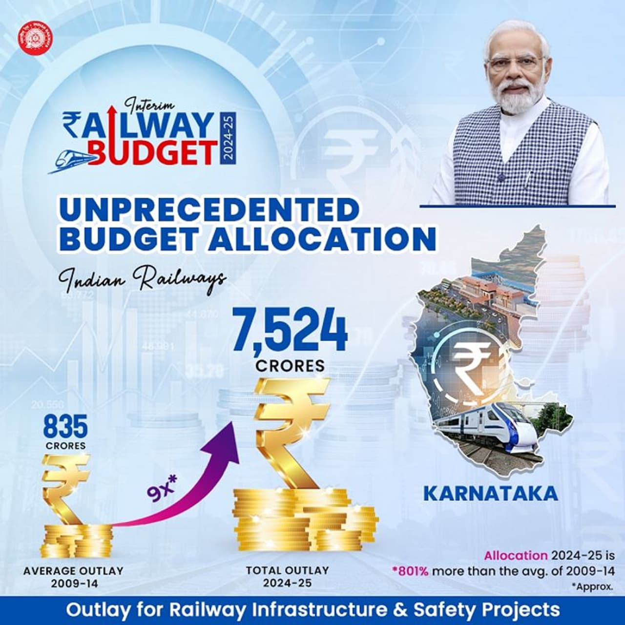 ಕರ್ನಾಟಕದಲ್ಲಿ ರೈಲ್ವೆ ಯೋಜನೆಗಳಿಗಾಗಿ 7524 ಕೋಟಿ ರೂಪಾಯಿಗಳನ್ನು ಕೇಂದ್ರ ಸರ್ಕಾರ ಮೀಸಲಿಟ್ಟಿದೆ. 2009 ರಿಂದ 2014ರ ಬಜೆಟ್ಗೆ ಹೋಲಿಸಿದರೆ, ಈ ಬಾರಿಯ ಬಜೆಟ್ನಲ್ಲಿ 805 ಕೋಟಿ ರೂಪಾಯಿ ಏರಿಕೆಯಾಗಿದೆ.