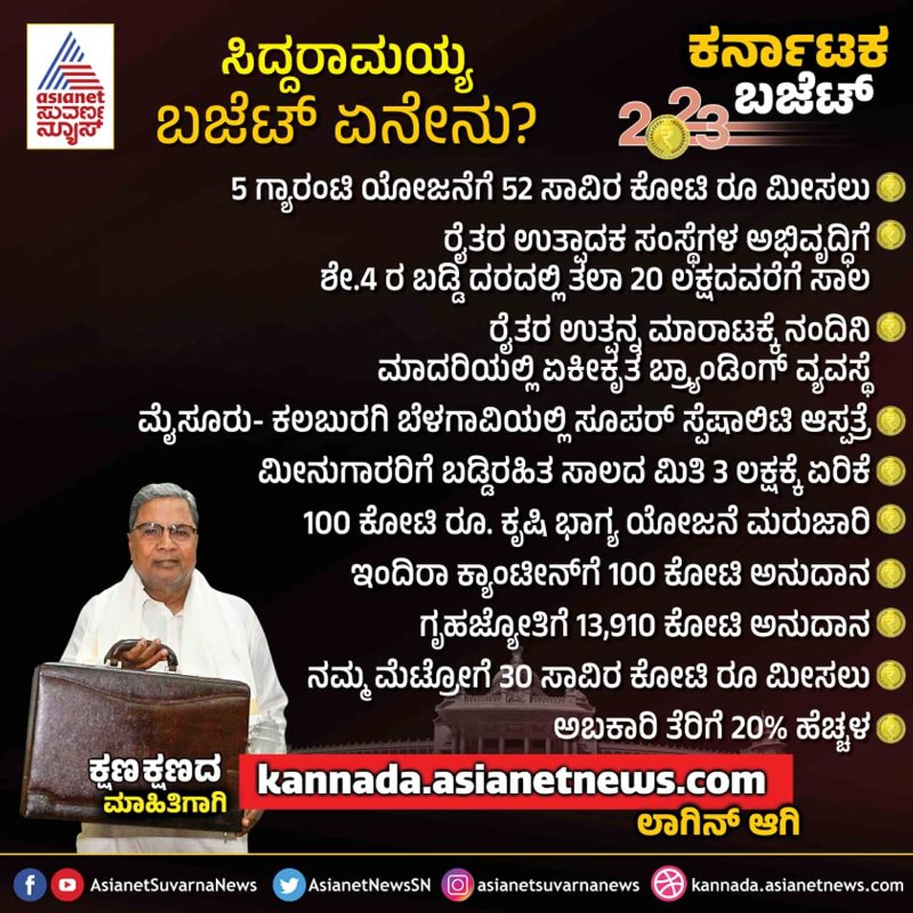 ಸರ್ವರಿಗೂ ಸಮಬಾಳು, ಸರ್ವರಿಗೂ ಸಮಪಾಲು ಎಂದು ಘೋಷಣೆ ಮಾಡುತ್ತಲೇ ಹೊಸ ಸರ್ಕಾರದ ಬಜೆಟ್ ಮಂಡಿಸಿದ ಮುಖ್ಯಮಂತ್ರಿ ಹಾಗೂ ಹಣಕಾಸು ಸಚಿವ ಸಿದ್ಧರಾಮಯ್ಯ, ಚುನಾವಣೆ ವೇಳೆ ಕಾಂಗ್ರೆಸ್ ಪಕ್ಷ ಘೋಷಣೆ ಮಾಡಿದ್ದ ಐದು ಗ್ಯಾರಂಟಿ ಯೋಜನೆಗಳಿಗೆ ಬಜೆಟ್ನಲ್ಲಿ ದೊಡ್ಡ ಪಾಲನ್ನು ಮೀಸಲಿಟ್ಟಿದ್ದಾರೆ. ಐದು ಗ್ಯಾರಂಟಿ ಯೋಜನೆಗಾಗಿ ಸರ್ಕಾರ 52 ಸಾವಿರ ಕೋಟಿ ಮೀಸಲಿಟ್ಟರುವುದಾಗಿ ಸಿದ್ಧರಾಮಯ್ಯ ಘೋಷಣೆ ಮಾಡಿದೆ. 'ನಮ್ಮ ಐದು ಗ್ಯಾರಂಟಿ ಯೋಜನೆಗಳಿಂದಾಗಿ ಒಂದು ವರ್ಷದಲ್ಲಿ ಸುಮಾರು 52,000 ಕೋಟಿ ರೂ.ಗಳನ್ನು ಅಂದಾಜು 1.30 ಕೋಟಿ ಕುಟುಂಬಗಳಿಗೆ ತಲುಪಿಸುವುದರಿಂದ ಪ್ರತೀ ಕುಟುಂಬಕ್ಕೆ ಮಾಸಿಕ 4,000 ರಿಂದ 5,000 ರೂ.ಗಳಷ್ಟು, ಅಂದರೆ, ವಾರ್ಷಿಕವಾಗಿ ಸರಾಸರಿ 48,000 ದಿಂದ 60,000 ರೂ.ಗಳಷ್ಟು ಹೆಚ್ಚುವರಿ ಆರ್ಥಿಕ ನೆರವು ನೀಡಿದಂತಾಗುತ್ತದೆ. ಇದು ಸಾರ್ವತ್ರಿಕ (Universal basic income) ಮೂಲ ಎಂಬ ಪರಿಕಲ್ಪನೆಯನ್ನು ದೇಶದಲ್ಲಿಯೇ ಪ್ರಥಮ ಬಾರಿಗೆ ಅನುಷ್ಠಾನಗೊಳಿಸಿ, ಅಭಿವೃದ್ಧಿಯ ಹೊಸ ಮಾದರಿಯನ್ನು ರೂಪಿಸುವ ಉದ್ದೇಶ ಹೊಂದಿದೆ' ಎಂದು ಬಜೆಟ್ ಭಾಷಣದಲ್ಲಿ ಸಿದ್ಧರಾಮಯ್ಯ ಹೇಳಿದ್ದಾರೆ.