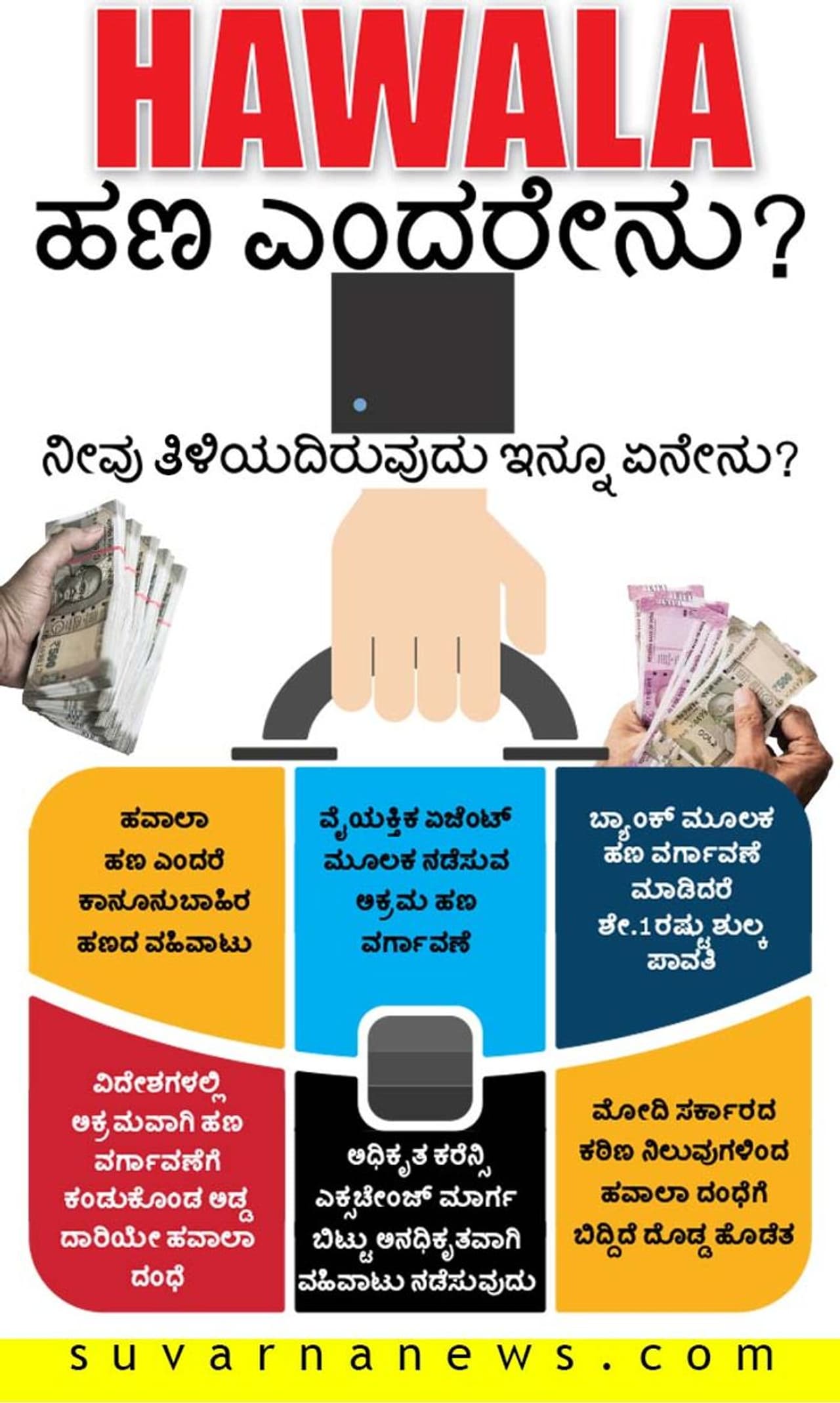 ಹವಾಲಾ ಹಗರಣದಲ್ಲಿ ಸಿಕ್ಕಿರುವ ಮಾಜಿ ಸಚಿವ ಡಿಕೆಶಿ| ಹವಾಲಾ ಹಣ ಎಂದರೇನು ಎಂದು ಹುಡುಕುತ್ತಿರುವ ಜನಸಾಮಾನ್ಯ| ಅಕ್ರಮ ಹಣ ವರ್ಗಾವಣೆಯ ದಂಧೆಯ ಆಳ ಅಗಲದ ಪರಿಚಯ| ಹವಾಲಾ ದಂಧೆಗೆ ಇದೆ ರೋಚಕ ಇತಿಹಾಸ| ಅರೆಬಿಕ್ ಭಾಷೆಯಲ್ಲಿ ಹವಾಲಾ ಎಂದರೆ ನಂಬಿಕೆ ಎಂದರ್ಥ| ಹವಾಲಾ ಹಣದ ಕುರಿತು ಸ್ಥೂಲ ಪರಿಚಯದ ಇನ್ಫೋಗ್ರಾಫಿಕ್|