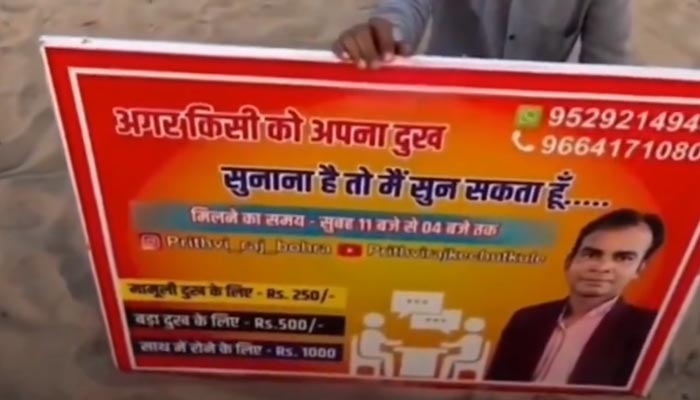 ಪೃಥ್ವಿರಾಜ್ ಬೊಹ್ರಾ ಎಂಬುವವರು ಮುಂಬೈನ ಬೀಚ್ನಲ್ಲಿ ಈ ಹೊಸ ಉದ್ಯಮವನ್ನು ಆರಂಭಿಸಿದ್ದು, 'ಕಿಸಿ ಕೋ ಅಪ್ನಾ ದುಃಖ ಸುನಾನಾ ಹೈ ತೋ ಮೇನ್ ಸನ್ ಸಕ್ತಾ ಹು' ಎಂಬ ಫಲಕವನ್ನು ಹಿಡಿದುಕೊಂಡು ಅವರು ಬೀಚ್ನಲ್ಲಿ ನಿಂತಿದ್ದಾರೆ. ಅಂದರೆ ಯಾರಿಗಾದರೂ ನಿಮ್ಮ ಕಷ್ಟ ಹೇಳಿಕೊಳ್ಳಬೇಕು ಅನಿಸಿದರೆ ಕೇಳುವುದಕ್ಕೆ ನಾನು ಸಿದ್ಧನಿದ್ದೇನೆ ಎಂದು ಬರೆದಿರುವ ಫಲಕ ಇದಾಗಿದೆ. ಬೀಚ್ಗೆ ಬಂದವರು ಯಾರೋ ಇವರ ವೀಡಿಯೋವನ್ನು ಸೋಶಿಯಲ್ ಮೀಡಿಯಾದಲ್ಲಿ ಹಾಕಿದ್ದು, ಈ ವೀಡಿಯೋಗೆ ಈಗ ಮಿಶ್ರ ಪ್ರತಿಕ್ರಿಯೆ ವ್ಯಕ್ತವಾಗಿದೆ. ವೀಡಿಯೋದಲ್ಲಿ ಅವರು ಮಾತುಗಳನ್ನು ಅಥವಾ ಸಮಸ್ಯೆಯನ್ನು ಕೇಳಿಸಿಕೊಳ್ಳುವುದಕ್ಕೆ ತಾವು ನಿಗದಿ ಮಾಡಿದ ಬೆಲೆಯನ್ನು ವಿವರಿಸಿದ್ದಾರೆ. ಸಣ್ಣಪುಟ್ಟ ಸಮಸ್ಯೆಗಳನ್ನು ಆಲಿಸಲು ಅವರು 250 ರೂ., ಹೆಚ್ಚು ಗಂಭೀರ ಸಮಸ್ಯೆಗಳಿಗೆ 500 ರೂ. ಮತ್ತು ಒಟ್ಟಿಗೆ ಕುಳಿತು ಅಳಬೇಕು ಎಂದು ಬಯಸಿದರೆ1,000 ರೂ. ವಿಧಿಸುತ್ತಾರೆ. ಇಂತಹ ಕೆಲಸಕ್ಕೆ ಯಾರಾದರೂ ಹಣ ನೀಡುತ್ತಾರೆಯೇ ಎಂದು ಕೇಳಿದಾಗ ಪ್ರತಿಕ್ರಿಯಿಸಿದ ಅವರು ಹೌದು ಜನರು ಬರುತ್ತಾರೆ ಹಣ ಪಾವತಿ ಮಾಡುತ್ತಾರೆ ಎಂದು ಅವರು ಪ್ರತಿಕ್ರಿಯಿಸಿದ್ದಾರೆ.