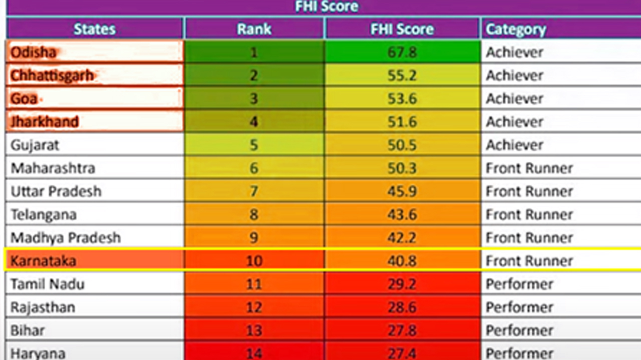 ನೀತಿ ಆಯೋಗದ ಹಣಕಾಸು ನಿರ್ವಹಣಾ ವರದಿಯಲ್ಲಿ ಕರ್ನಾಟಕ 10ನೇ ಸ್ಥಾನಕ್ಕೆ ಕುಸಿದಿದೆ. ಒಡಿಶಾ ಅಗ್ರಸ್ಥಾನದಲ್ಲಿದ್ದು, ಜಾರ್ಖಂಡ್ ಮತ್ತು ಛತ್ತೀಸ್ಗಢ ಕ್ರಮವಾಗಿ ಎರಡು ಮತ್ತು ನಾಲ್ಕನೇ ಸ್ಥಾನದಲ್ಲಿವೆ. 2014-23ರ ಅವಧಿಯ ಆರ್ಥಿಕ ಪ್ರಗತಿ ಪರಿಗಣಿಸಿ ವರದಿ ರೂಪಿಸಲಾಗಿದೆ. ಕರ್ನಾಟಕದ ಕುಸಿತಕ್ಕೆ ಕಳವಳ ವ್ಯಕ್ತವಾಗಿದೆ. ಪಂಜಾಬ್, ಆಂಧ್ರಪ್ರದೇಶ, ಪಶ್ಚಿಮ ಬಂಗಾಳ ಹಾಗೂ ಕೇರಳ ಕೆಳ ಸ್ಥಾನದಲ್ಲಿವೆ.