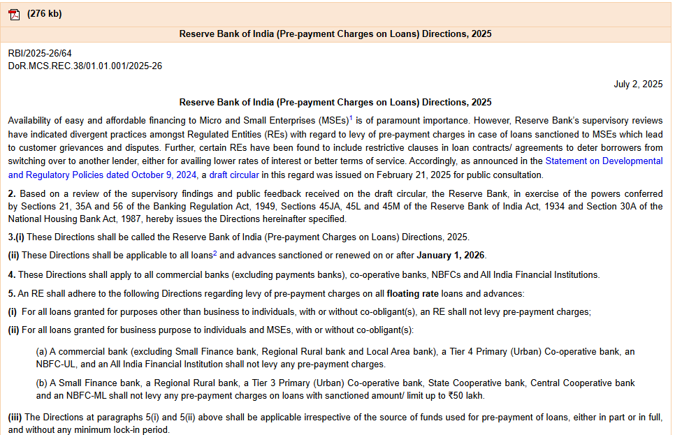 Reserve Bank of India (Pre-payment Charges on Loans) Directions, 2025: ಪೂರ್ವಪಾವತಿ ಶುಲ್ಕಗಳಿಗೆ ಸಂಬಂಧಿಸಿದಂತೆ ಬ್ಯಾಂಕ್ಗಳು ವಿಭಿನ್ನ ಅಭ್ಯಾಸಗಳನ್ನು ಬಳಸುತ್ತಿರುವುದನ್ನು ಗಮನಿಸಿದ ನಂತರ, RBI, ಫೋರ್ಕ್ಲೋಸರ್ ಶುಲ್ಕಗಳ ವಿಧಿಸುವಿಕೆಯನ್ನು ತೆಗೆದುಹಾಕಲು ನಿರ್ಧರಿಸಿದೆ.