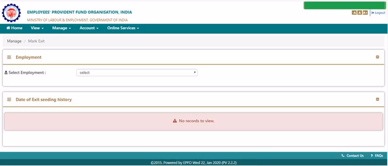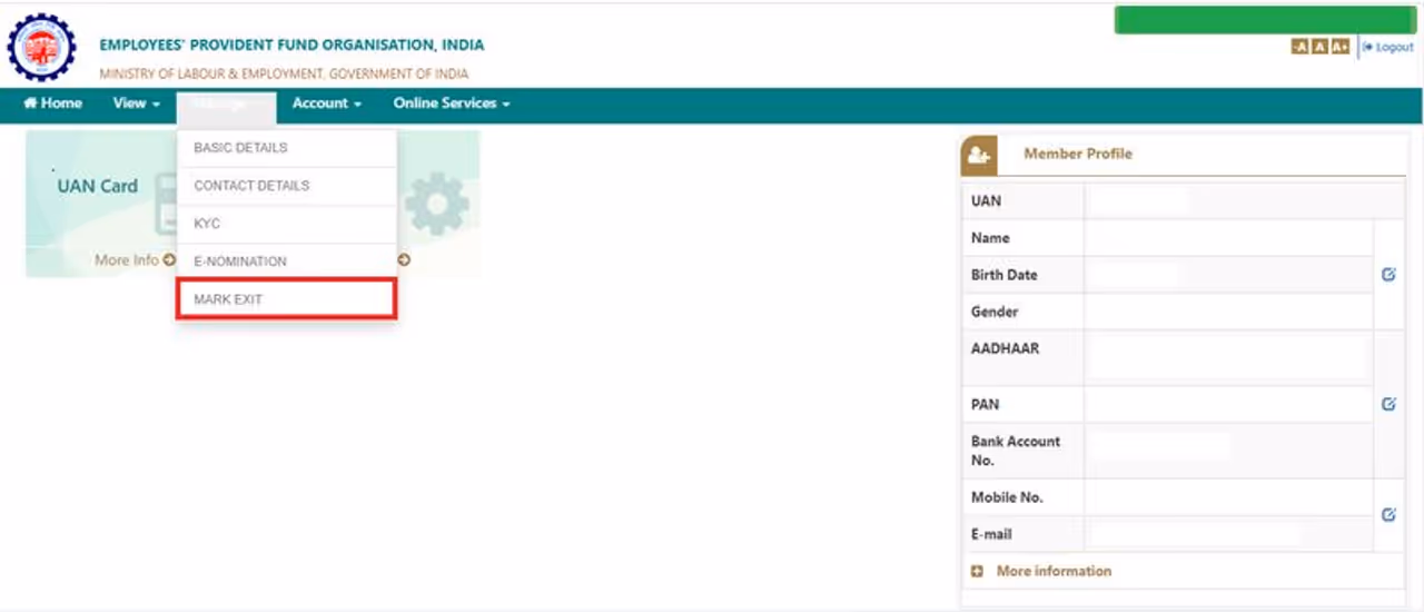* ಬಳಿಕ ಮಾರ್ಕ್ ಎಕ್ಸಿಟ್ [Mark Exit] ಕ್ಲಿಕ್ ಮಾಡಿ, ಸೆಲೆಕ್ಟ್ ಎಂಪ್ಲಾಯ್ಮೆಂಟ್[Select Employment] ನಿಂದ ಈ ಹಿಂದಿನ PF ಅಕೌಂಟ್ ನಂಬರ್ ಆಯ್ಕೆ ಮಾಡಿ.