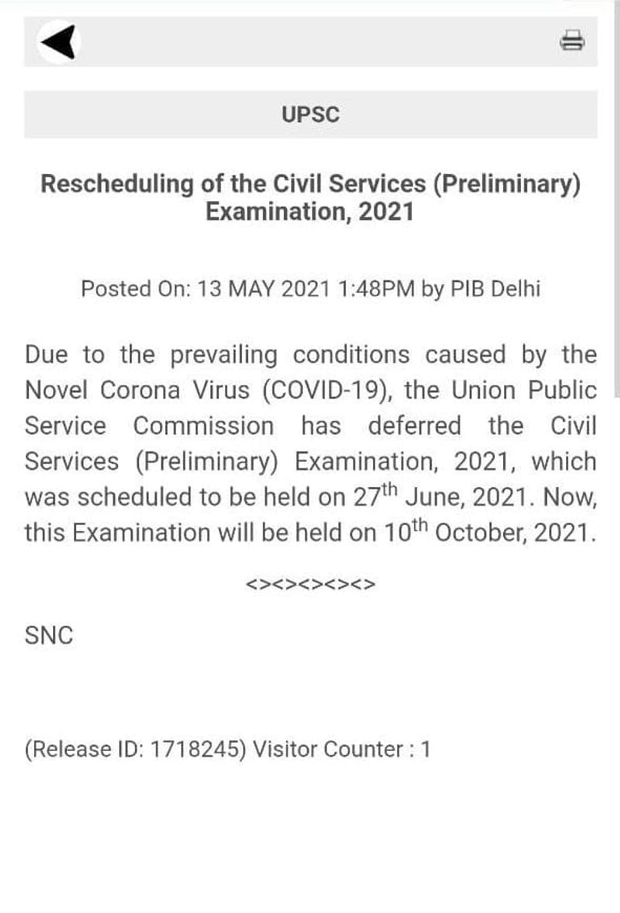 * ಯುಪಿಎಸ್ ಇ ನಡೆಸುವ ನಾಗರೀಕ ಸೇವೆ (ಪ್ರಿಲಿಮ್ಸ್) ಪರೀಕ್ಷೆ ಮುಂದೂಡಿಕೆ* ಕೊರೋನಾ ಕಾರಣಕ್ಕೆ ಪರೀಕ್ಷೆ ನಡೆಸುವುದು ಅಸಾಧ್ಯ* ಅಕ್ಟೋಬರ್ 10 ರಂದು ಪರೀಕ್ಷೆ ನಡೆಸಲು ತೀರ್ಮಾನ* ಜೂನ್ 27 ರಂದು ನಡೆಯಬೇಕಿದ್ದ ಪರೀಕ್ಷೆ