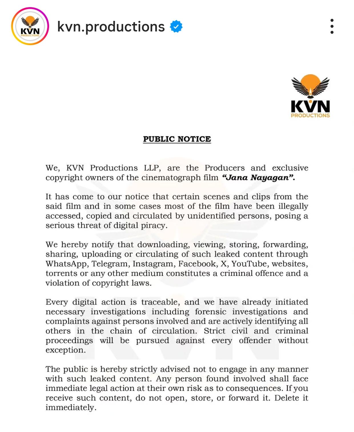 "ಜನ ನಾಯಗನ್" ಚಿತ್ರಕ್ಕೆ ನಿರ್ಮಾಪಕರು ಮತ್ತು ವಿಶೇಷ ಹಕ್ಕುಸ್ವಾಮ್ಯ ಮಾಲೀಕರು ಕೆವಿಎನ್ ಪ್ರೊಡಕ್ಷನ್ಸ್ ಆಗಿರುತ್ತದೆ. ಚಿತ್ರದ ಮೇಲೆ ನಿಗೂಢ ವ್ಯಕ್ತಿಗಳಿಂದ ಅಕ್ರಮ ಪ್ರವೇಶವಾಗಿದೆ. ಕಾಪಿ ಮಾಡಿದ್ದಾರೆ ಮತ್ತು ಪ್ರಸಾರ ಮಾಡಿದ್ದಾರೆ, ಇದು ಡಿಜಿಟಲ್ ಪೈರಸಿಯಾಗಿದೆ.