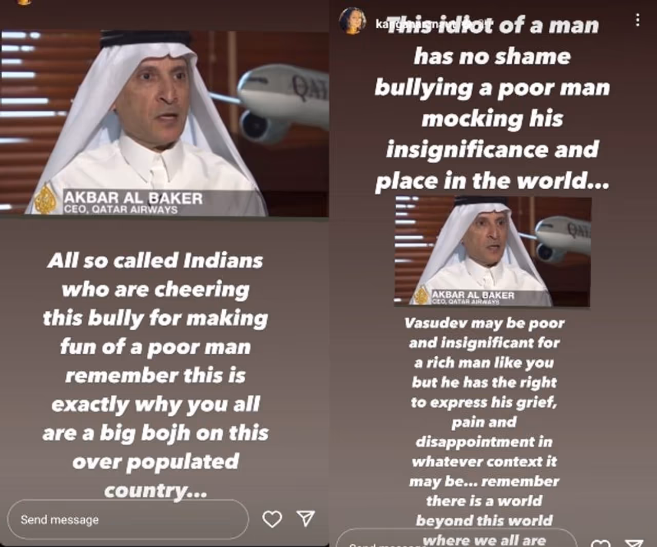 ಈ ಮೂರ್ಖನಿಗೆ ಬಡವನನ್ನು ಬೆದರಿಸುವುದರಲ್ಲಿ ನಾಚಿಕೆ ಇಲ್ಲ, ಜಗತ್ತಿನಲ್ಲಿ ಅವನ ಅತ್ಯಲ್ಪ ಮತ್ತು ಸ್ಥಾನವನ್ನು ಅಪಹಾಸ್ಯ ಮಾಡುತ್ತಾನೆ. "ವಾಸುದೇವ್ ನಿಮ್ಮಂತಹ ಶ್ರೀಮಂತರಿಗೆ ಬಡವ ಮತ್ತು ಅತ್ಯಲ್ಪವಾಗಿರಬಹುದು ಆದರೆ ಯಾವುದೇ ಸಂದರ್ಭದಲ್ಲಿ ತನ್ನ ದುಃಖ, ನೋವು ಮತ್ತು ನಿರಾಶೆಯನ್ನು ವ್ಯಕ್ತಪಡಿಸುವ ಹಕ್ಕಿದೆ ... ಈ ಪ್ರಪಂಚದ ಆಚೆಗೆ ನಾವೆಲ್ಲರೂ ಸಮಾನರು ಎಂದು ನೆನಪಿಡಿ. .," ಎಂದು ತಮ್ಮ ಸ್ಟೋರಿಗಳಲ್ಲಿ ಬರೆದುಕೊಂಡಿದ್ದಾರೆ. ಆದರೆ, ಇದು ಪರೋಡಿ ವಿಡಿಯೋ ಎಂದು ಗೊತ್ತಾದ ಬಳಿಕ, ಕಂಗನಾ ರಾಣಾವತ್ ತಮ್ಮ ಇನ್ಸ್ ಟಾಗ್ರಾಮ್ ಸ್ಟೋರೀಸ್ ಗಳನ್ನು ಡಿಲೀಟ್ ಮಾಡಿದ್ದಾರೆ.