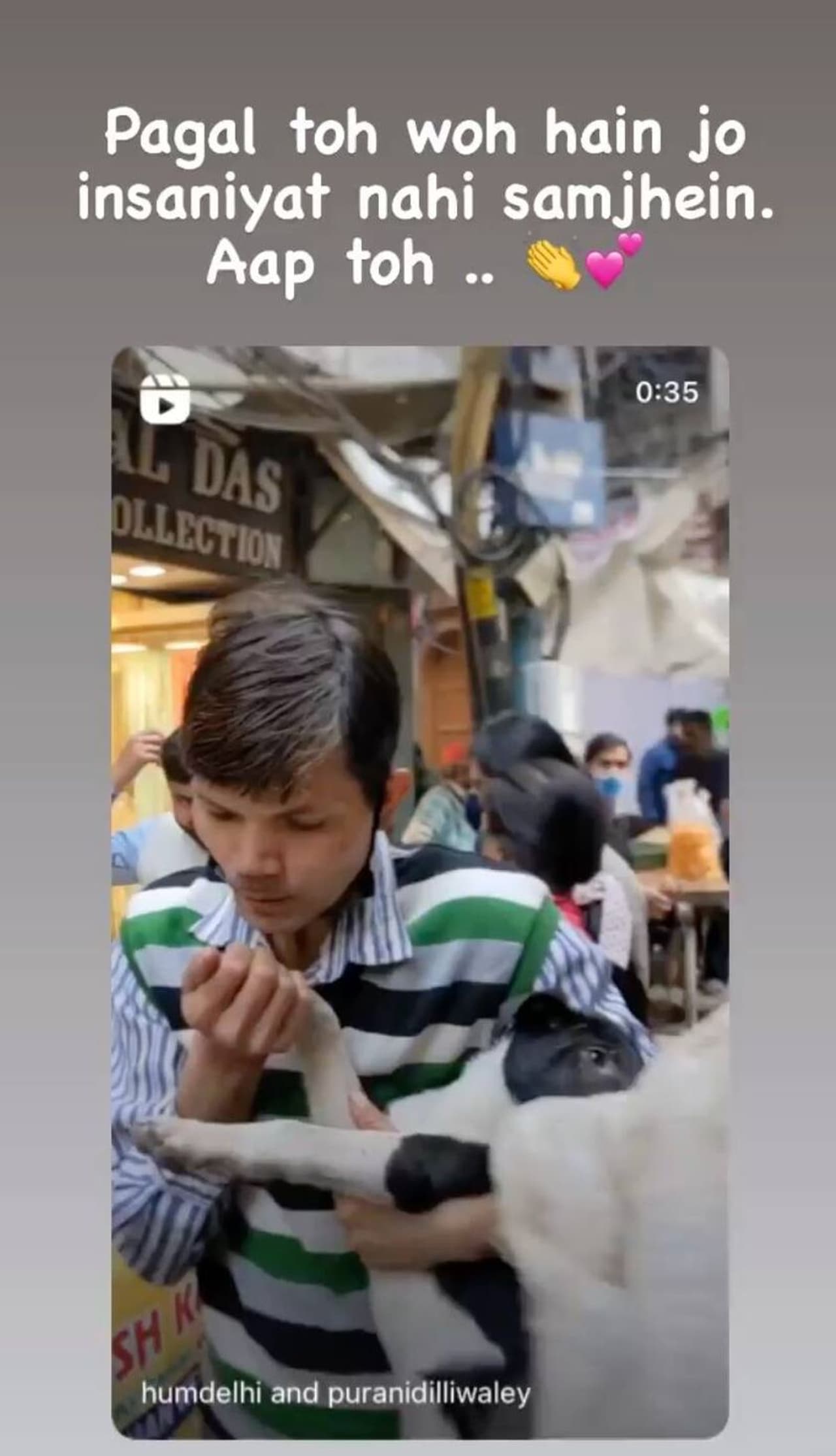 ವಿಡಿಯೋದಲ್ಲಿ ವ್ಯಕ್ತಿಯೊಬ್ಬ ಗಾಯಗೊಂಡ ಬೀದಿನಾಯಿಯನ್ನು ಕೈಯಲ್ಲಿ ಹಿಡಿದುಕೊಂಡಿದ್ದು, ಇನ್ನೊಬ್ಬ ವ್ಯಕ್ತಿಯೊಂದಿಗೆ ಈ ಕುರಿತಾಗಿ ವಾದ ಮಾಡುತ್ತಿದ್ದಾರೆ. ಬೀದಿನಾಯಿಯ ಕುರಿತಾಗಿ ಅತಿಯಾದ ಕಾಳಜಿ ವಹಿಸುತ್ತಿರುವ ವಿಚಾರಕ್ಕಾಗಿ ಪಕ್ಕದಲ್ಲಿದ್ದ ಇನ್ನೊಬ್ಬ ಹಿರಿಯ ವ್ಯಕ್ತಿ ಅತನನ್ನು ಹುಚ್ಚ ಎಂದು ಕರೆಯುತ್ತಾರೆ. ಅದಕ್ಕೆ ಪ್ರತಿಕ್ರಿಯೆ ನೀಡುತ್ತಿರುವ ವ್ಯಕ್ತಿ, "ಮೇ ಪಾಗಲ್ ಹೂಂ, ತುಮ್ಹೆ ಮೇ ಪಾಗಲ್ ದಿಖಾಯಿ ದೇ ರಹಾ ಹುಂ, ಪಶು ಕೀ ಸೇವಾ ಕರ್ನಿ ಚಾಹಿಯೇ ಹಮೇಶಾ" (ಹೌದು ನಾನು ಹುಚ್ಚ, ನಿಮಗೆ ನಾನು ಹುಚ್ಚನಂತೆ ಕಾಣುತ್ತಿದ್ದೇನೆ. ಒಬ್ಬನು ಯಾವಾಗಲೂ ಅಸಹಾಯಕ ವ್ಯಕ್ತಿಗಳಿಗೆ ಸೇವೆ ಸಲ್ಲಿಸಬೇಕು) ಎಂದು ಹೇಳಿದ್ದಾನೆ.
