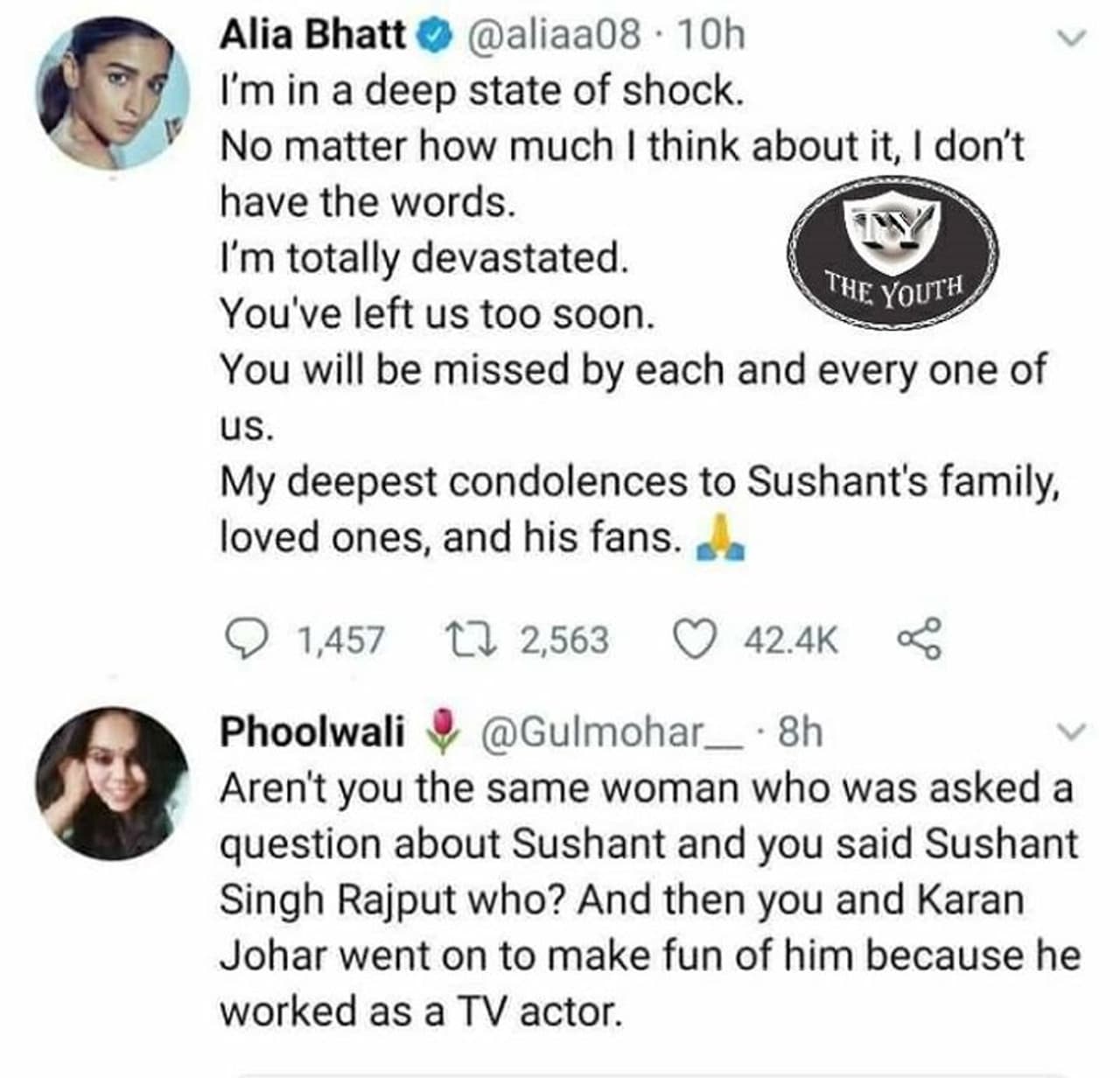 'ಕಾಫಿ ವಿತ್ ಕರಣ್ ಕಾರ್ಯಕ್ರಮದಲ್ಲಿ ಕರಣ್ ನಿನ್ನನ್ನು ಸುಶಾಂತ್ ಬಗ್ಗೆ ಪ್ರಶ್ನೆ ಕೇಳಿದಾಗ ನೀವೇ ಅಲ್ವಾ ಯಾರದ್ದು ಸುಶಾಂತ್ ಸಿಂಗ್ ರಜಪೂತ್ ಅಂತ ಕೇಳಿದ್ದು? ತಕ್ಷಣವೇ ಇಬ್ಬರು ಕಣ್ಣು ಮಿಟುಕಿಸುವುದು ಹೋ ಅವನು ಆ ಕಿರುತೆರೆ ನಟ ಎಂದು ಗೇಲಿ ಮಾಡಿದ್ದು? ಈಗ ಅವನನ್ನು ಮಿಸ್ ಮಾಡಿಕೊಳ್ಳುತ್ತಿರುವೆ ಎಂದು ಹೇಳುತ್ತಿರುವುದು' ಎಂದು ಪೂಲ್ವಾಲಿ ಎಂಬುವರು ಪ್ರಶ್ನಿಸಿದ್ದಾರೆ.