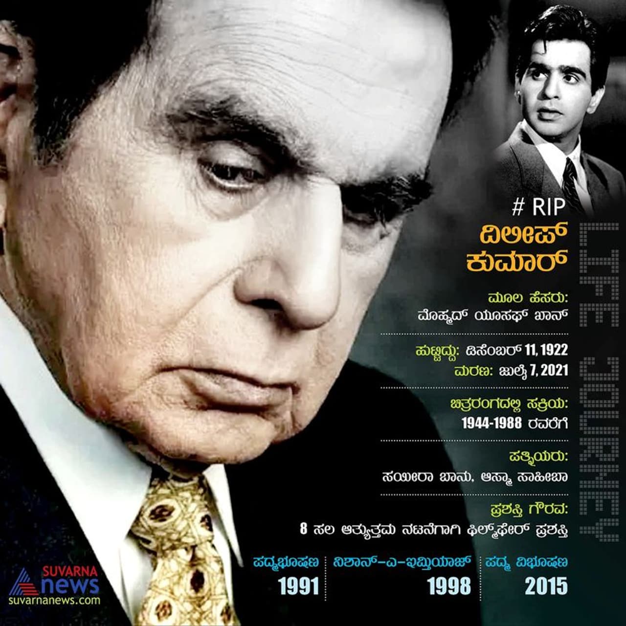 1922 ಡಿಸೆಂಬರ್ 11ರಂದು ಪೇಶಾವರ (ಇಂದಿನ ಪಾಕಿಸ್ತಾನ) ಕಿಸ್ಸಾ ಖವಾನಿ ಬಜಾರ್ನಲ್ಲಿ ಜನಸಿದ ದಿಲೀಪ್ ಕುಮಾರ್ ಮೂಲ ಹೆಸರು ಮಹಮ್ಮದ್ ಯೂಸುಫ್ ಖಾನ್. ಹೀಗಾಗೇ ಅವರನ್ನು ಬಾಲಿವುಡ್ನ ಮೊದಲ ಖಾನ್ ಎಂದೇ ಎನ್ನಲಾಗುತ್ತಿತ್ತು. ಇನ್ನು ಫಿಲಂಫೇರ್ ಪ್ರಶಸ್ತಿ ಪಡೆದ ಮೊದಲ ನಟ ಎಂಬ ಹೆಗ್ಗಳಿಕೆ ಕೂಡಾ ದಿಲೀಪ್ ಕುಮಾರ್ಗಿದೆ. ಚಿತ್ರರಂಗ ಮಾತ್ರವಲ್ಲದೇ ರಾಜಕೀಯದಲ್ಲೂ ಅವರು ಗುರುತಿಸಿಕೊಂಡಿದ್ದರು.