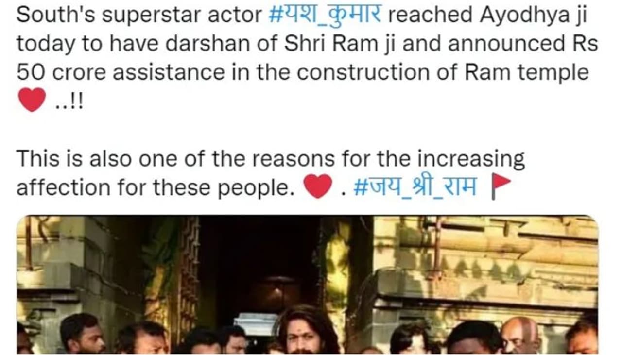 ಅಷ್ಟಕ್ಕೂ ಯಶ್ 50 ಕೋಟಿ ರೂಪಾಯಿ ದೇಣಿಗೆ ನೀಡಿರುವುದು ನಿಜನಾ? ಎಂದು ಕೇಳಿದ್ರೆ ಇದು ಸುಳ್ಳು ಎನ್ನುವುದು ಖಚಿತವಾಗಿದೆ. ಒಂದು ವೇಳೆ ಯಶ್ 50 ಕೋಟಿ ರೂ. ಕೊಟ್ಟಿದ್ರೆ ದೊಡ್ಡ ಮಟ್ಟದಲ್ಲಿ ಸುದ್ದಿಯಾಗಿರುತ್ತಿತ್ತು. ಅಂದ್ಮೇಲೆ ಇದು ಕೇವಲ ವದಂತಿ ಅಷ್ಟೆ. ಅಷ್ಟಕ್ಕೂ ಈ ರೀತಿಯ ಸುದ್ದಿ ವೈರಲ್ ಆಗಲು ಕಾರಣವಾಗಿದ್ದು ಯಶ್ ಅವರ ಒಂದು ಫೋಟೋ. ಪಂಚೆ, ಶರ್ಟ್ ಮತ್ತು ಶಾಲು ಧರಿಸಿದ್ದ ಯಶ್ ಸಾಂಪ್ರದಾಯಿಕ ಉಡುಗೆಯಲ್ಲಿ ದೇವಸ್ಥಾನದಲ್ಲಿ ಕಾಣಿಸಿಕೊಂಡಿದ್ದರು. ಇದನ್ನು ನೋಡಿದ ಒಬ್ಬರು ಯಶ್ ಆಯೋಧ್ಯೆ ರಾಮಮಂದಿರಕ್ಕೆ ಭೇಟಿ ನೀಡಿದ್ದರು. ಆಗ ರಾಮ ಮಂದಿರ ನಿರ್ಮಾಣಕ್ಕೆ 50 ಕೋಟಿ ರೂಪಾಯಿ ದೇಣಿಗೆ ನೀಡಿದ್ದಾರೆ ಎಂದು ಸಾಮಾಜಿಕ ಜಾಲತಾಣದಲ್ಲಿ ಪೋಸ್ಟ್ ಒಂದು ವೈರಲ್ ಆಗಿದೆ.
