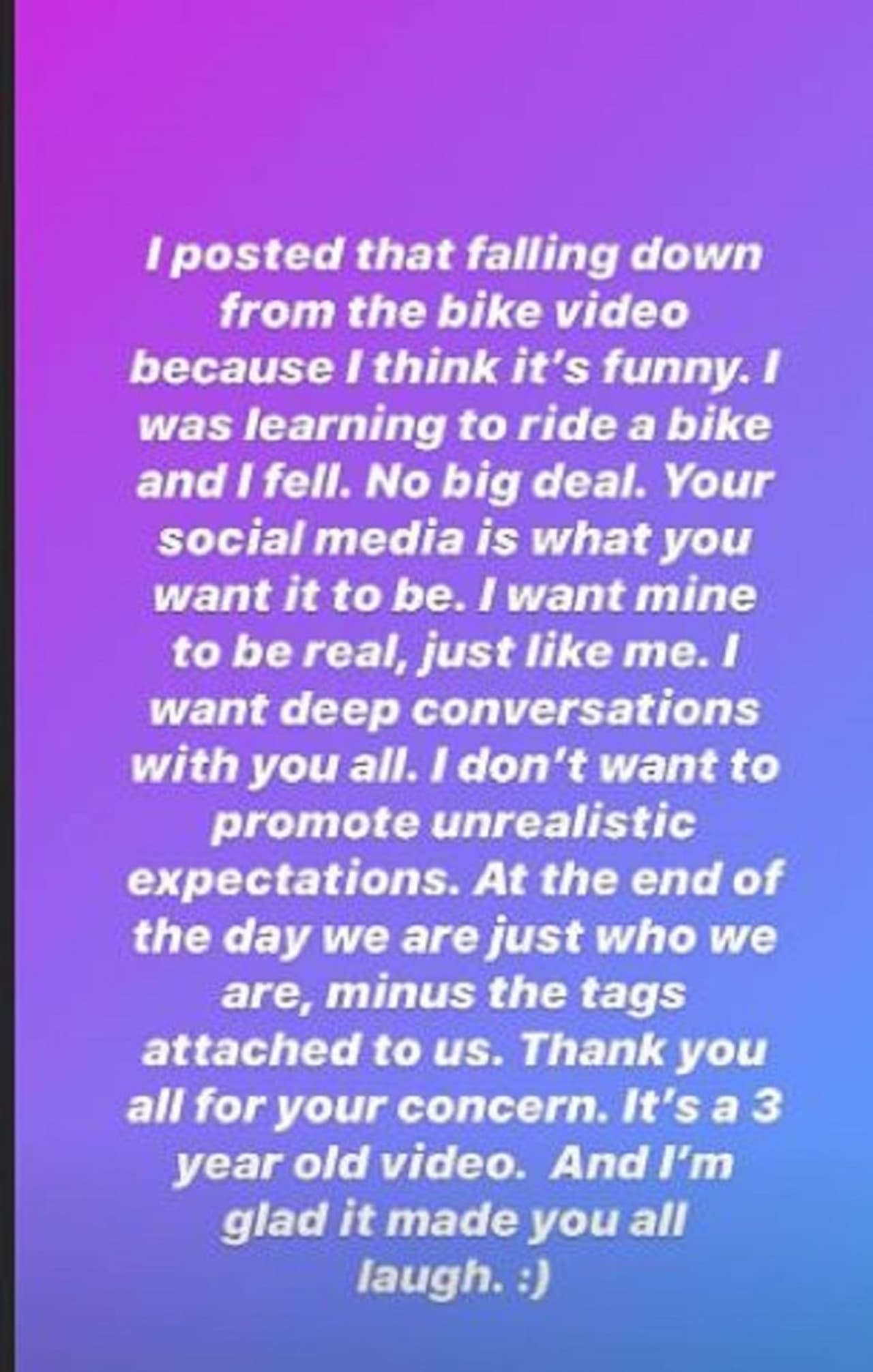 'ನಾನು ಬೈಕಿಂದ ಬಿದ್ದಿರುವ ವಿಡಿಯೋ ಪೋಸ್ಟ್ ಮಾಡಲು ಕಾರಣ ನನಗೆ ಅದು ತಮಾಷೆ ಎಂದೆನಿಸಿತ್ತು. ನಾನು ಓಡಿಸಲು ಪ್ರಯತ್ನಿಸುತ್ತಿದ್ದ ಹಾಗೆ ಬಿದ್ದೆ. ಇದೇನು ದೊಡ್ಡ ವಿಷಯವೇನಲ್ಲ.ನಾವು ನಮ್ಮ ಸೋಷಿಯಲ್ ಮೀಡಿಯಾದಲ್ಲಿ ನಮಗೇನು ಬೇಕು ಅದನ್ನು ಶೇರ್ ಮಾಡಿಕೊಳ್ಳುತ್ತೇವೆ.ವಾಸ್ತವಕ್ಕೆ ಹತ್ತಿರವಿಲ್ಲದ ವಿಚಾರಗಳನ್ನು ಪ್ರಚಾರ ಮಾಡುವುದಕ್ಕೆ ಇಷ್ಟವಿಲ್ಲ. ರಿಯಲ್ ಆಗಿರುವ ವಿಷಯಗಳನ್ನೇ ಹಂಚಿಕೊಳ್ಳಲು ಇಚ್ಚಿಸುತ್ತೇನೆ ಹಾಗೂ ನಿಮ್ಮೊಂದಿಗೆ ಡೀಪ್ ಸಂದರ್ಶನ ಮಾಡಲು ಇಷ್ಟ ಪಡುತ್ತೇನೆ. ನೀವೆಲ್ಲರೂ ತೋರಿಸಿದ ಪ್ರೀತಿಗೆ ನಾನು ಆಭಾರಿ. ಮೂರು ವರ್ಷಗಳ ಹಿಂದಿನ ಈ ವಿಡಿಯೋ ನಿಮಗೆ ನಗು ತರಿಸಿರುವುದಕ್ಕೆ ನನಗೆ ಸಂತೋಷವಾಗಿದೆ ' ಎಂದು ಹೇಳಿದ್ದಾರೆ.