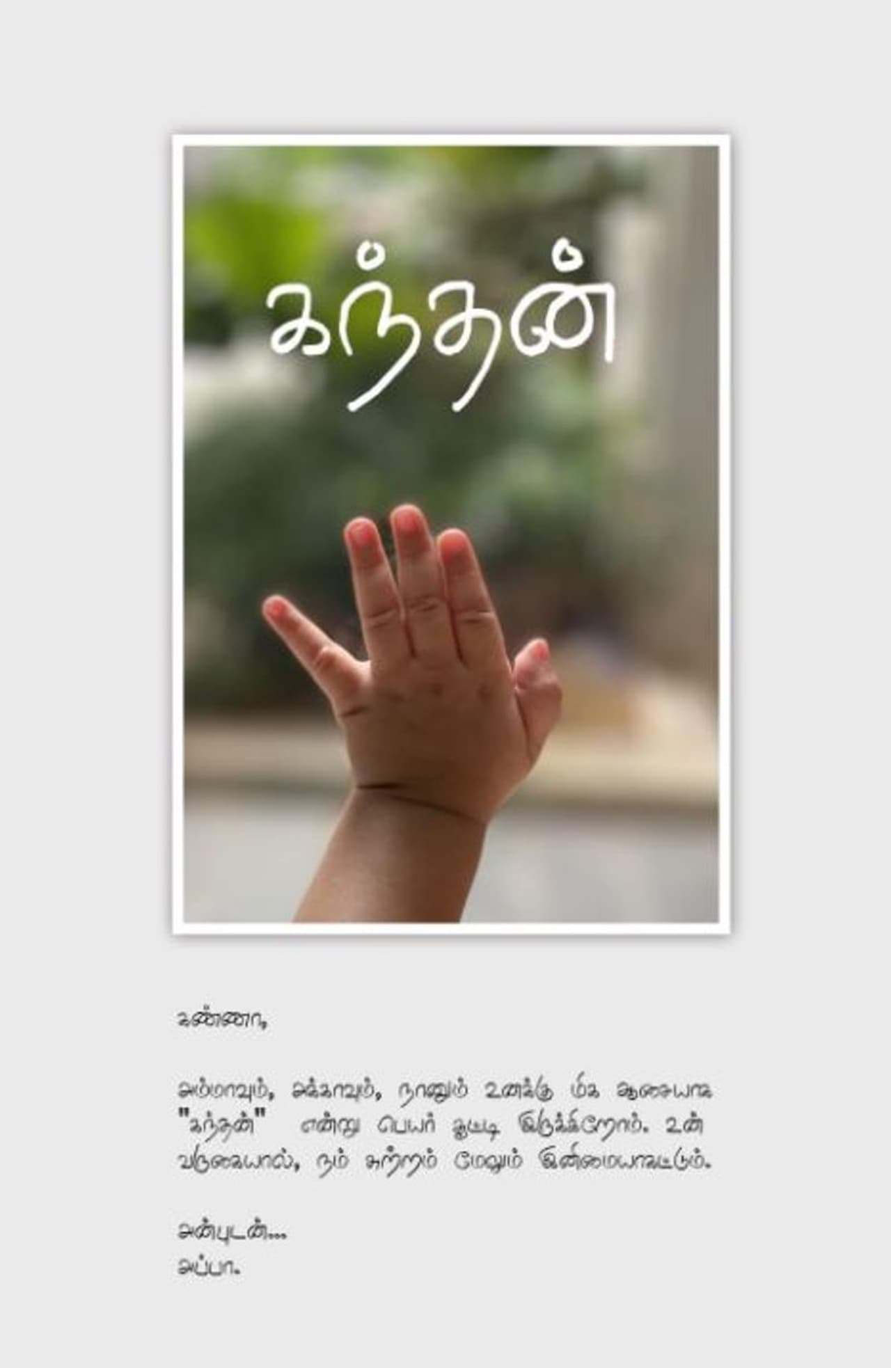 ಪುತ್ರನ ಪುಟ್ಟ ಕೈ ಫೋಟೋ ಶೇರ್ ಮಾಡಿಕೊಂಡು, 'ನಿನ್ನ ತಾಯಿ, ಅಕ್ಕ ಮತ್ತು ನಾನು ನಿನಗೆ ಕಂದನ್ ಎಂದು ಹೆಸರಿಟ್ಟಿದೀವೆ. ನಿನ್ನ ಆಗಮನದಿಂದ ನಮ್ಮ ಕುಟುಂಬದಲ್ಲಿ ಮತ್ತಷ್ಟು ಸಂತೋಷ ತುಂಬಿರಲಿ. ನಿನ್ನ ಪ್ರೀತಿಯ ಅಪ್ಪ,' ಎಂದು ಬರೆದಿದ್ದಾರೆ.