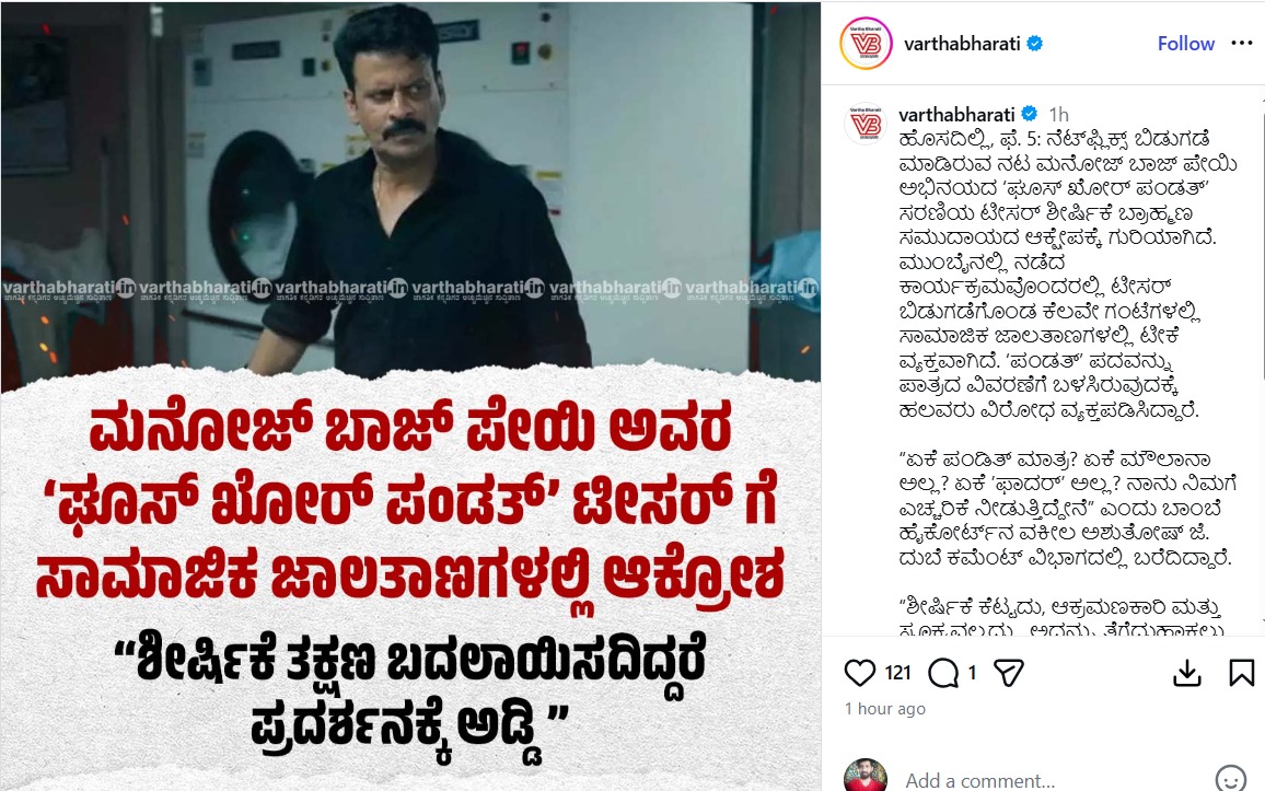 ಬಾಲಿವುಡ್ನ ಪ್ರತಿಭಾವಂತ ನಟ ಮನೋಜ್ ಬಾಜಪೇಯಿ (Manoj Bajpayee) ಯಾವಾಗಲೂ ತಮ್ಮ ನೈಜ ನಟನೆಯ ಮೂಲಕ ಪ್ರೇಕ್ಷಕರ ಮನ ಗೆಲ್ಲುತ್ತಾರೆ. ಆದರೆ ಈ ಬಾರಿ ಅವರು ತಮ್ಮ ಅಭಿನಯಕ್ಕಿಂತ ಹೆಚ್ಚಾಗಿ ತಮ್ಮ ಹೊಸ ಸಿನಿಮಾದ ಶೀರ್ಷಿಕೆಯಿಂದಲೇ ದೊಡ್ಡ ವಿವಾದಕ್ಕೆ ಸಿಲುಕಿದ್ದಾರೆ. ನೆಟ್ಫ್ಲಿಕ್ಸ್ನ ಬಹುನಿರೀಕ್ಷಿತ ಕ್ರೈಮ್ ಥ್ರಿಲ್ಲರ್ ಚಿತ್ರ 'ಘೂಸ್ಖೋರ್ ಪಂಡತ್' (Ghooskhor Pandat) ಈಗ ಕಾನೂನು ಸಂಕಷ್ಟದಲ್ಲಿದೆ. ಚಿತ್ರದ ಶೀರ್ಷಿಕೆಯು ಒಂದು ನಿರ್ದಿಷ್ಟ ಸಮುದಾಯವನ್ನು ಅವಮಾನಿಸುವಂತಿದೆ ಎಂಬ ಕಾರಣಕ್ಕೆ ದೆಹಲಿ ಹೈಕೋರ್ಟ್ನಲ್ಲಿ ಚಿತ್ರದ ಬಿಡುಗಡೆಗೆ ತಡೆ ಕೋರಿ ಅರ್ಜಿ ಸಲ್ಲಿಕೆಯಾಗಿದೆ.