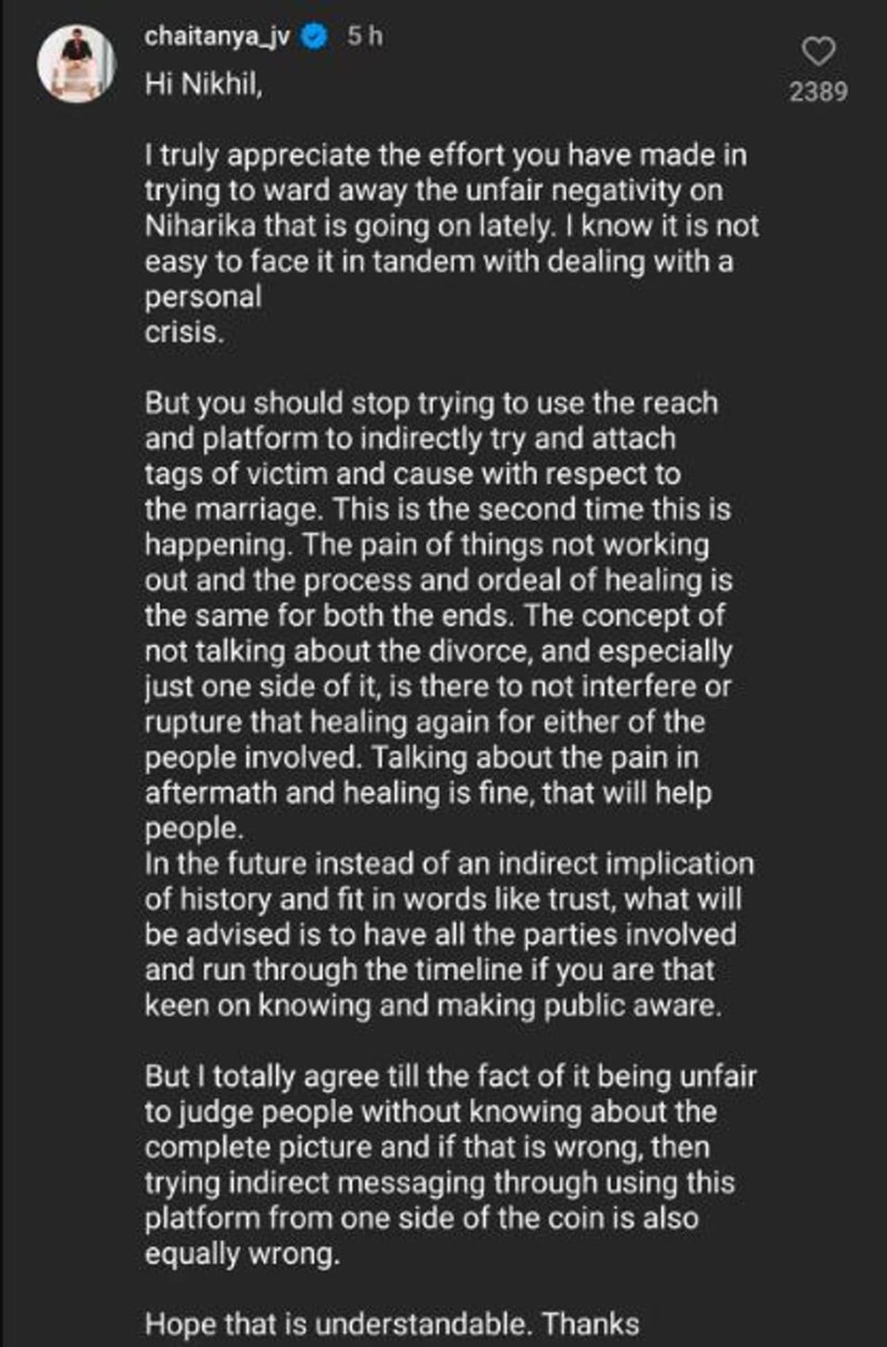 ನಿಖಿಲ್ ಮತ್ತು ನಿಹಾರಿಕಾ ಸಂದರ್ಶನವನ್ನು ಚೈತನ್ಯಾ ನೋಡಿಲ್ಲವಾದರೂ ವೀಕ್ಷಿಸಿದವರು ಕೊಟ್ಟ ಕಾಮೆಂಟ್ಗಳನ್ನು ಗಮನಸಿಗೆ ನಿಖಿಲ್ ಪೋಸ್ಟ್ಗೆ ಚೈತನ್ಯಾ ಕಾಮೆಂಟ್ ಮಾಡಿದ್ದರು. 'ಇತ್ತೀಚಿಗೆ ನಿಹಾರಿಕಾ ಕೊನಿಡೆಲಾ ವಿರುದ್ಧ ಹರಿದಾಡುತ್ತಿರುವ ನೆಗೆಟಿವ್ ಕಾಮೆಂಟ್ಗಳನ್ನು ದೂರ ಮಾಡಲು ನೀವು ಪಡುತ್ತಿರುವ ಶ್ರಮವನ್ನು ಮೆಚ್ಚುವೆ. ವೈಯಕ್ತಿಕ ಜೀವನದಲ್ಲಿ ಬಗ್ಗೆ ಖಂಡಿತಾ ಟೀಕೆಗಳನ್ನು ಎದುರಿಸುವುದು ಸುಲಭದ ಮಾತಲ್ಲ.ಸಾಮಾಜಿಕ ಜಾಲತಾಣವನ್ನು ಬಳಸಿಕೊಂಡು ಪ್ರಚಾರ ತೆಗೆದುಕೊಳ್ಳುವುದನ್ನು ನಿಲ್ಲಿಸಬೇಕು ಇರದಿಂದ ಈ ಮದುವೆ ಮುರಿದ್ದು ಬೀಳಲು ಕಾರಣ ಮತ್ತು ಅಪರಾಧಿ ಅನ್ನೋ ಪಟ್ಟ ಕೊಡುವುದು ತಡೆಯಬಹುದು. ಈ ರೀತಿ ನೀವು ಮಾಡುತ್ತಿರುವುದು ಎರಡನೇ ಸಲ. ಈ ಘಟನೆಯಿಂದ ನಮ್ಮಿಬ್ಬರಿಗೂ ಆಗಿರುವ ಪ್ರಾಸೆಸ್, ನೋವು ಮತ್ತು ಹೀಲಿಂಗ್ ಇಬ್ಬರಿಗೂ ಒಂದೇ ಆಗಿದೆ' ಎಂದು ಚೈತನ್ಯಾ ಕಾಮೆಂಟ್ ಮಾಡಿದ್ದಾರೆ.