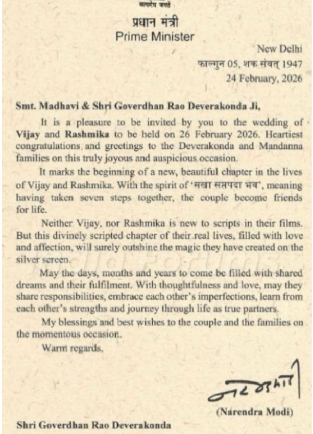 ವಿಜಯ್ ದೇವರಕೊಂಡ ಅವರ ಪೋಷಕರಿಗೆ ಬರೆದ ಪತ್ರದಲ್ಲಿ ಪ್ರಧಾನಿ ಮೋದಿ ಅವರು ಹೀಗೆ ಬರೆದಿದ್ದಾರೆ: "ಫೆಬ್ರವರಿ 26, 2026 ರಂದು ನಡೆಯಲಿರುವ ವಿಜಯ್ ಮತ್ತು ರಶ್ಮಿಕಾ ಅವರ ವಿವಾಹಕ್ಕೆ ನನ್ನನ್ನು ಆಹ್ವಾನಿಸಿದ್ದಕ್ಕಾಗಿ ಸಂತೋಷವಾಗಿದೆ. ಈ ಅತ್ಯಂತ ಹರ್ಷದಾಯಕ ಮತ್ತು ಮಂಗಳಕರ ಸಂದರ್ಭದಲ್ಲಿ ದೇವರಕೊಂಡ ಮತ್ತು ಮಂದಣ್ಣ ಕುಟುಂಬಗಳಿಗೆ ನನ್ನ ಹೃತ್ಪೂರ್ವಕ ಅಭಿನಂದನೆಗಳು."