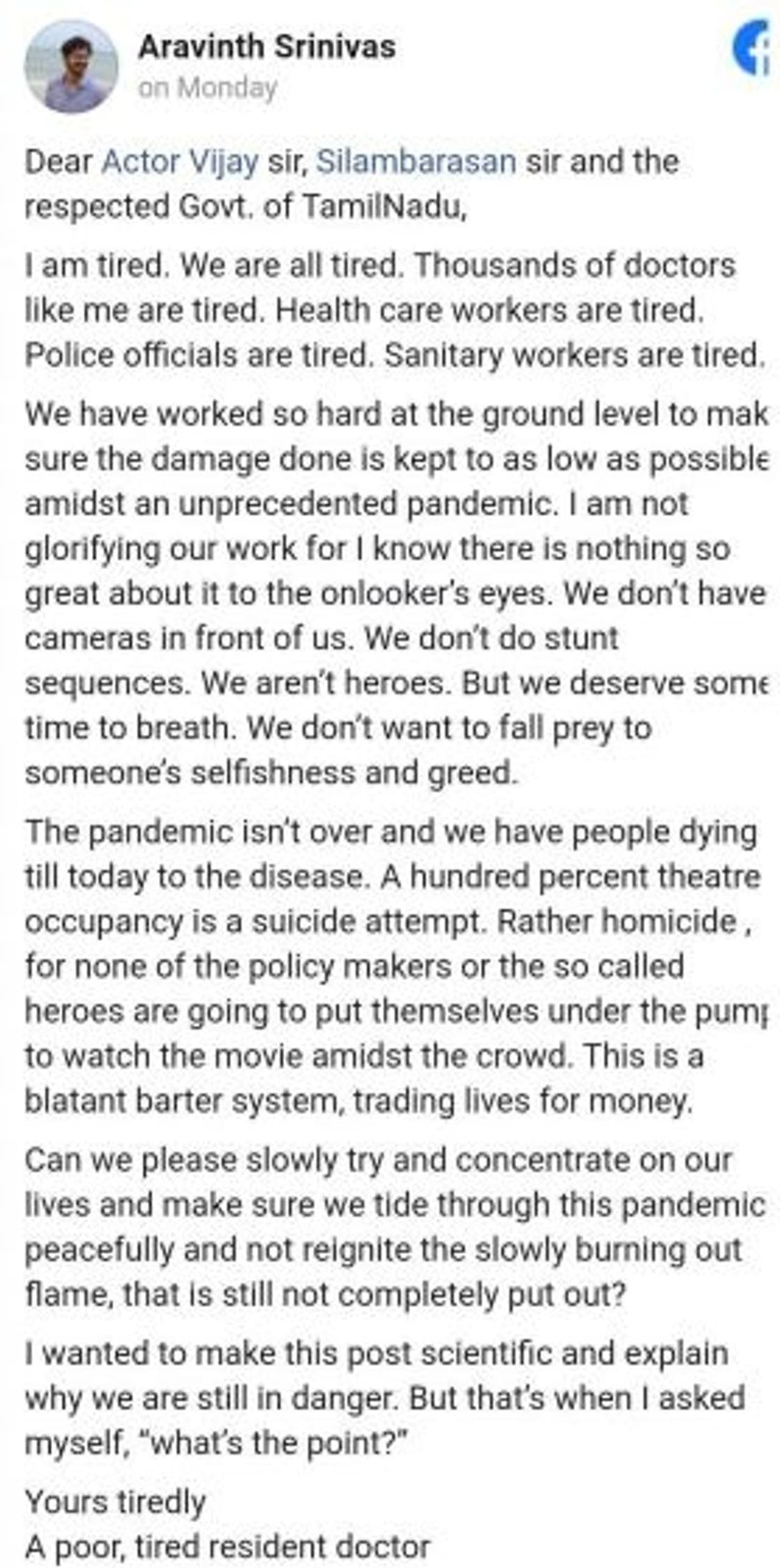 ನಾವು ಸುಸ್ತಾಗಿದ್ದೀವಿ, ಎಲ್ಲರೂ ದಣಿದಿದ್ದಾರೆ. ಆಗಿರುವ ತೊಂದರೆಯಿಂದ ಎಲ್ಲವನ್ನು ಸರಿ ಮಾಡಬೇಕೆಂದು ವೈದ್ಯರು, ಪೊಲೀಸರು ಹಾಗೂ ಆರೋಗ್ಯ ಕಾರ್ಯಕರ್ತರು ಎಡೆಬಿಡದೇ ಶ್ರಮಿಸುತ್ತಿದ್ದಾರೆ. ಇದರಿಂದ ಆಗುವ ಪರಿಣಾಮ ಗೊತ್ತಿದ್ದರೂ ನಾವೆಲ್ಲರೂ ಹೆದರದೇ ಕೆಲಸ ಮಾಡುತ್ತಲೇ ಇದ್ದೇವೆ. ನಾವು ಮಾಡಿರುವ ಕೆಲಸವನ್ನು ಹೊಗಳಿ ಕೊಳ್ಳುತ್ತಿಲ್ಲ. ಆದರಿದು ಸತ್ಯ. ನಮ್ಮೆದುರು ಕ್ಯಾಮೆರಾ ಇಲ್ಲ, ನಾವು ಯಾವುದೇ ಸ್ಟಂಟ್ ಮಾಡಲಾಗದು. ಹೀರೋಗಳಂತೂ ಅಲ್ವೇ ಅಲ್ಲ. ಆದರೆ ಉಸಿರಾಡಲು ನಮಗಾದರೂ ಸಮಯ ಬೇಕು ಅಲ್ವಾ? ಯಾರೊಬ್ಬರ ಮೋಜಿಗಾಗಿ ನಾವು ಬಲಿಯಾಗುವುದು ಎಷ್ಟು ಸರಿ? ಸೋಂಕು ಕಡಿಯಾಗಿಲ್ಲ. ಈಗಲೂ ಜನರು ಆ ಸೋಂಕಿಗೆ ಸಾಯುತ್ತಿದ್ದಾರೆ. ಈ ಸಮಯದಲ್ಲಿ ಚಿತ್ರಮಂದಿರಗಳಿಗೆ ಶೇ.100ರಷ್ಟು ಪ್ರೇಕ್ಷಕರಿಗೆ ಅನುಮತಿ ನೀಡಿದರೆ, ಅದು ಆತ್ಮಹತ್ಯೆ ಯತ್ನಕ್ಕೆ ಸಮ. ಜೀವಕ್ಕೆ ಹದರುವವರು ಖಂಡಿತವಾಗಿಯೂ ಜನ ತುಂಬಿರುವ ಚಿತ್ರಮಂದಿರಕ್ಕೆ ಬರುವುದಿಲ್ಲ. ಮಸ್ತಿಗಾಗಿ ಹಣ ಕೊಟ್ಟು ಪ್ರಾಣ ಕಳೆದುಕೊಳ್ಳುವುದಿಲ್ಲ. ದಯವಿಟ್ಟು ನಮ್ಮ ಬಗ್ಗೆಯೂ ಚಿಂತಿಸಿ. ಇದರ ಬಗ್ಗೆ ನಾನು ವೈಜ್ಞಾನಿಕವಾಗಿ ವಿವರಣೆ ನೀಡಲು ಬಯಸುತ್ತೇನೆ. ಇಂತಿ ನಿಮ್ಮ ದಣಿದಿರುವ ಡಾಕ್ಟರ್,' ಎಂದು ಅರವಿಂದ್ ಪತ್ರ ಮುಸಿದ್ದಾರೆ. ವೈದ್ಯ ಲೋಕದ ಕಷ್ಟ ಕಾರ್ಪಣ್ಯವನ್ನು ತಮ್ಮದೇ ದಾಟಿಯಲ್ಲಿ ವಿವರಿಸಿದ್ದು ಎಲ್ಲ ಮನಕ್ಕೂ ಮುಟ್ಟುವಂತಿದೆ.