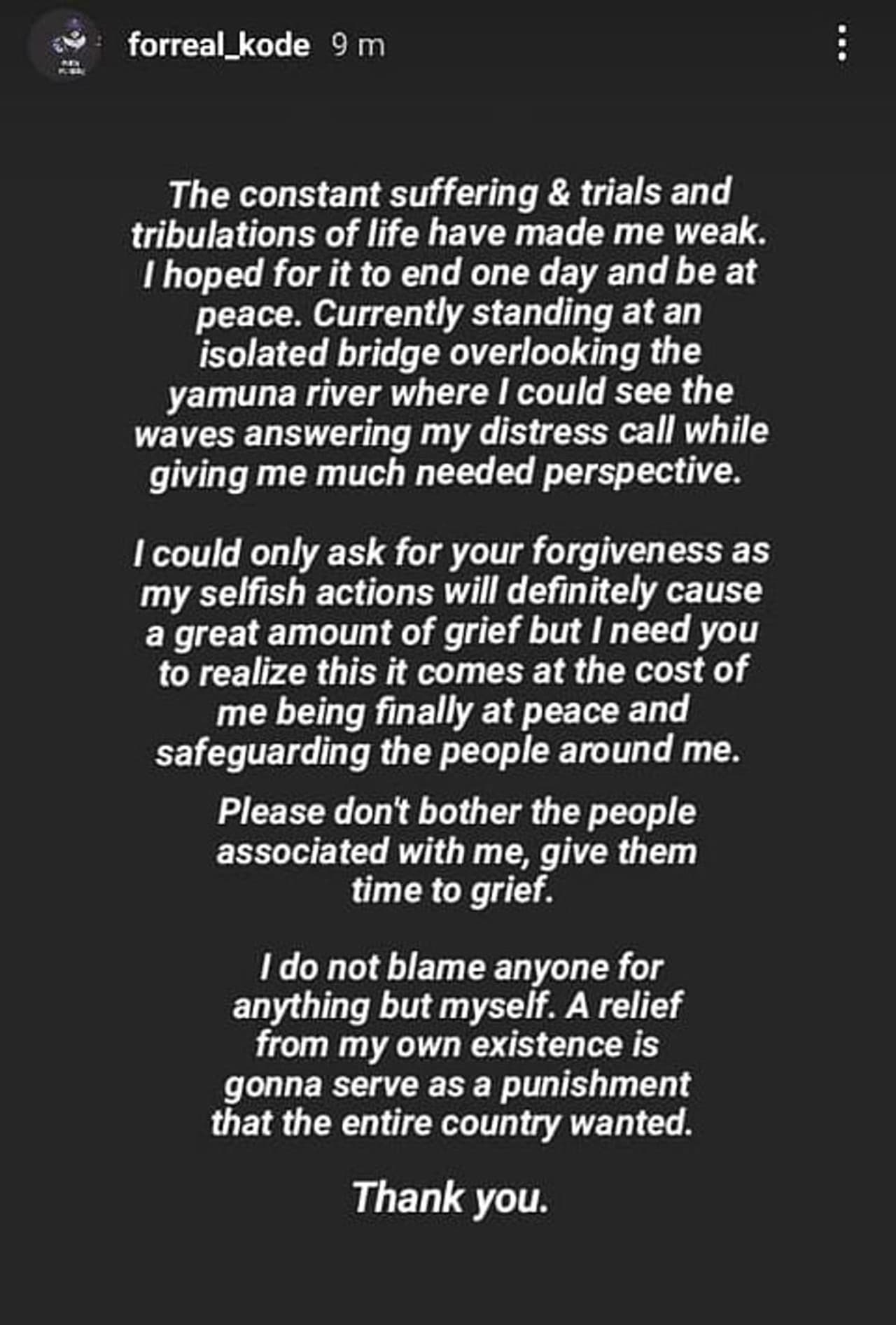 ಕಾಣೆಯಾಗುವ ಮೊದಲು ಆದಿತ್ಯ ಈ ಕೆಳಗಿನ ಸಂದೇಶವನ್ನು ಹೊರಹಾಕಿದ್ದಾನೆ: 'ನಾನು ಯಾರನ್ನೂ ದೂಷಿಸುವುದಿಲ್ಲ. ನನ್ನ ಸ್ವಂತ ಅಸ್ತಿತ್ವದಿಂದ ನಾನು ದೂರವಾಗುವುದು ಇಡೀ ದೇಶವು ಬಯಸಿದ ಶಿಕ್ಷೆಯಾಗಿದೆ' ಎಂದು ಬರೆದಿದ್ದಾರೆ.